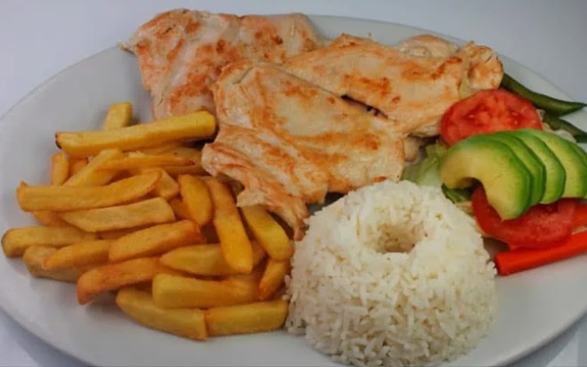 PAPAS FRITAS, ARROZ, PECHUGA Y ENSALADA