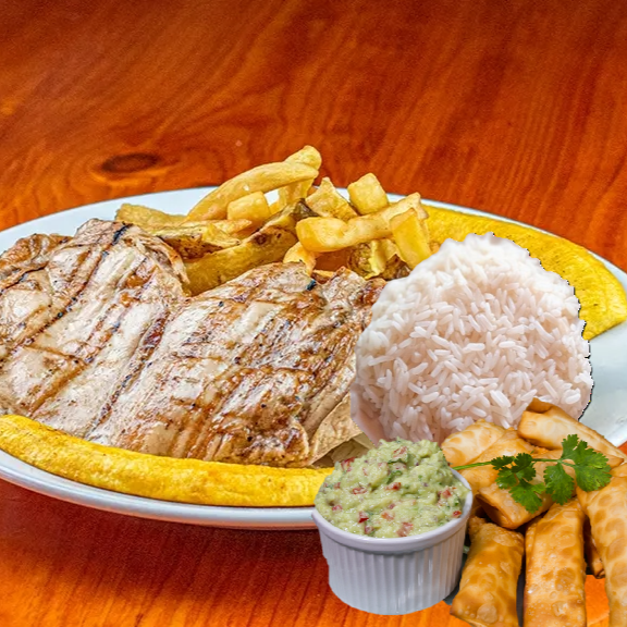 PECHUGA A LA PLANCHA CON ARROZ Y PAPAS FRITAS MAS 3 UND DE TEQUEÑOS RELLENOS CON QUESO
