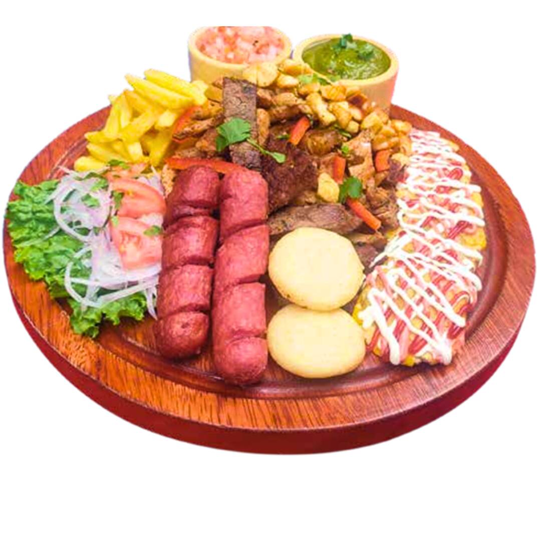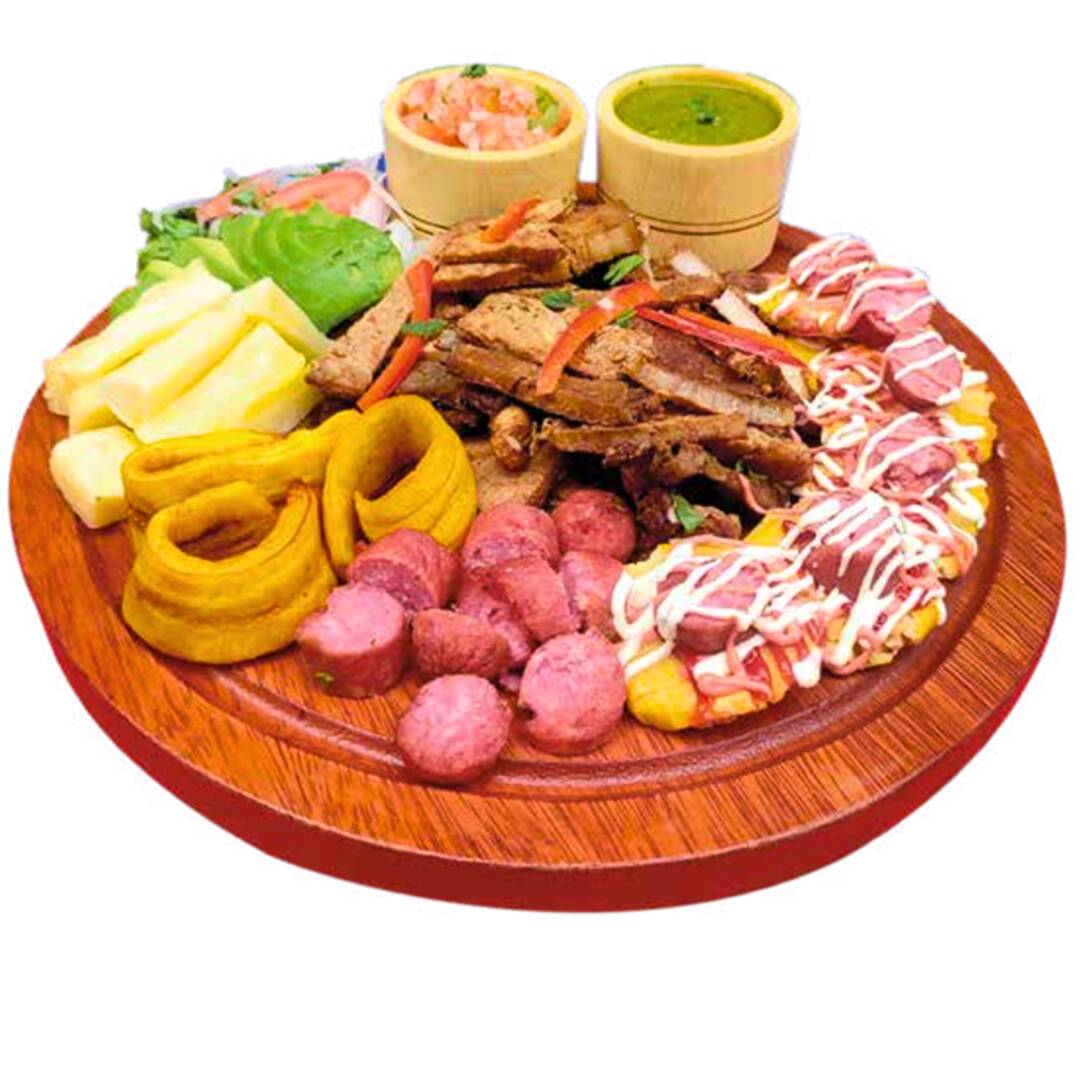 Res, pollo y cerdo, tuca, doble chorizo parrillero, aguacate, tostones, queso rallado y salsa de la casa.