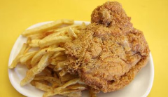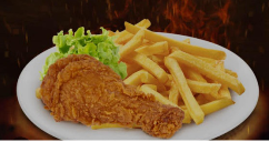 Pieza broaster(presa disposición de tienda)acompañado papas onduladas , hot dog ahumado y cremas