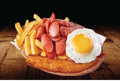Papas fritas + hotdog ahumado +platano frito + huevo montado