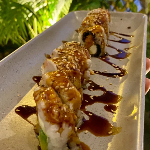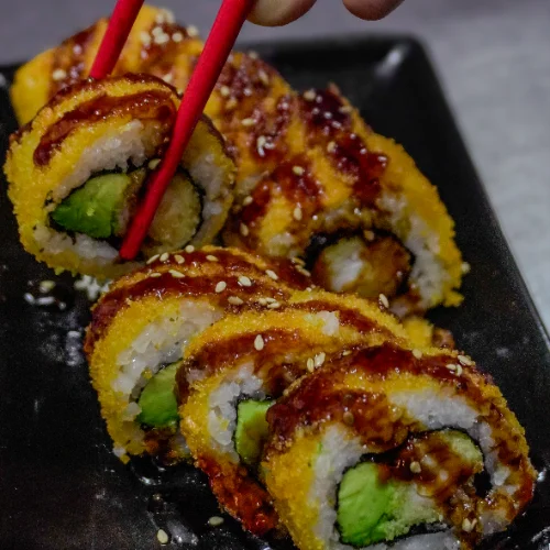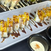 Descubre el delicioso inka maki, que combina langostinos frescos y queso crema untado con palta del día, todo envuelto en finas láminas de pescado del día. se acompaña con una suave y sabrosa salsa teriyaki, creando una fusión perfecta de texturas y sabores.