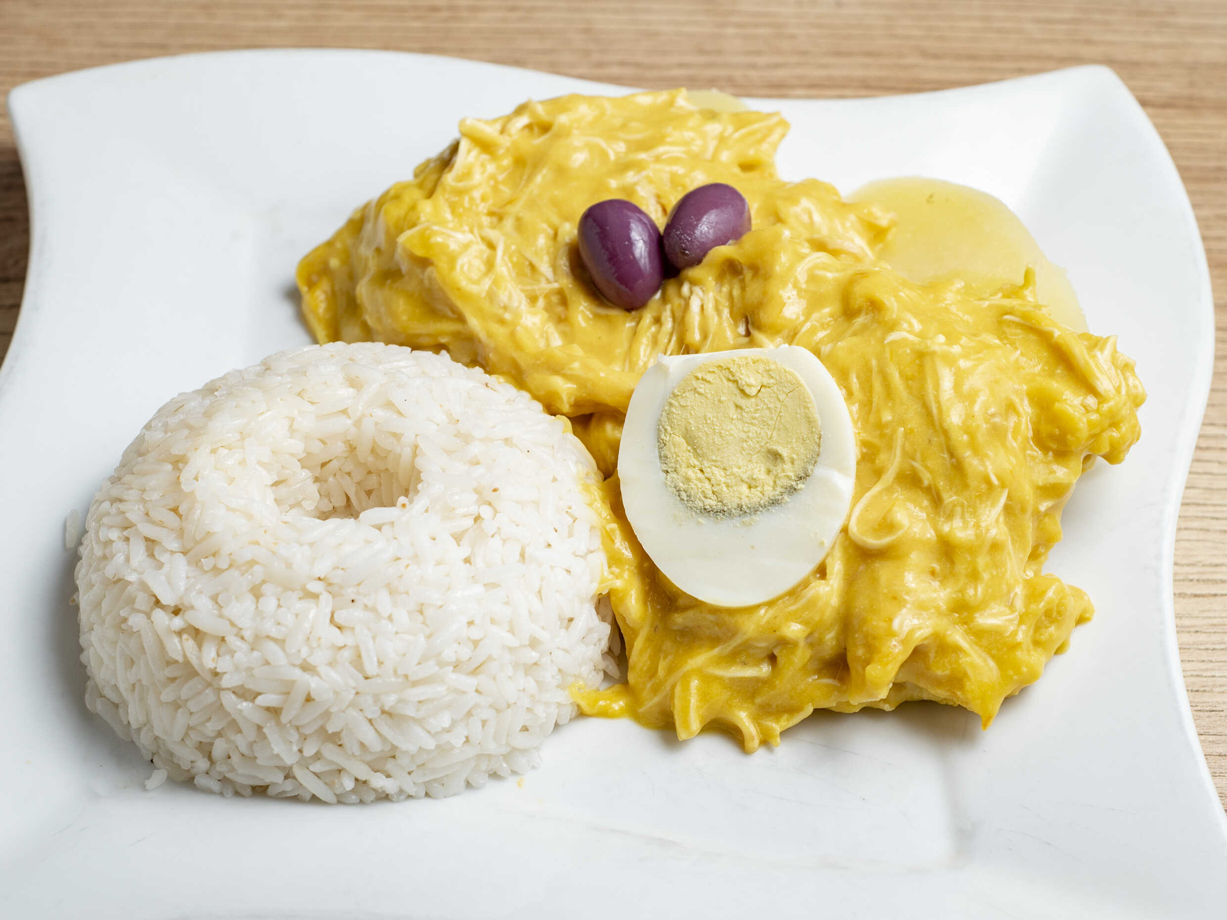 Ají de gallina acompañado de arroz y papas sancochadas.