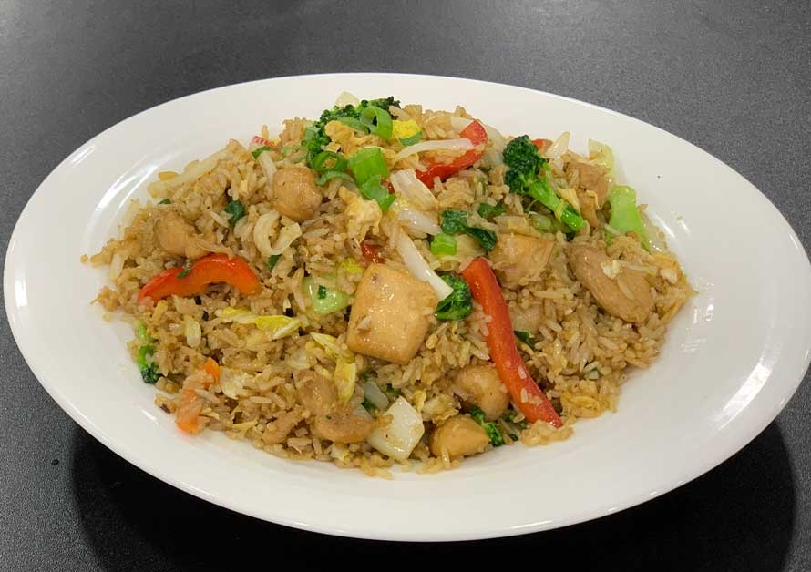 Arroz salteado al wok con pollo, huevo y cebolla china, acompañado de verduras chinas.