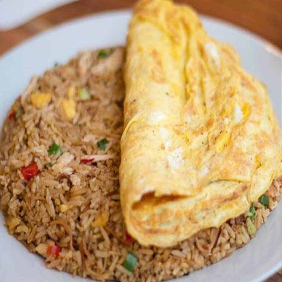 Huevo frito con verduras variadas, acompañado de arroz salteado con tallarín, frijolito chino, fideo chino, huevo y pollo picado.