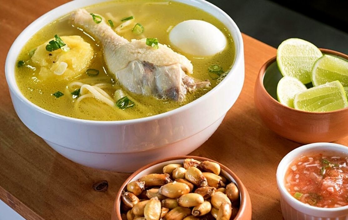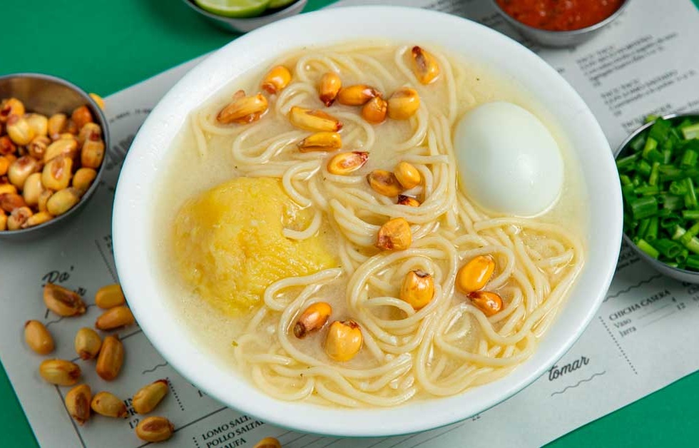 Caldo de gallina, papa amarilla, huevo, cebolla china, cancha y fideos.