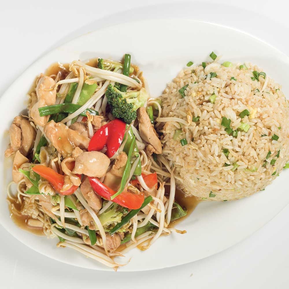 Trozos de pollo salteado con verduras y arroz chaufa