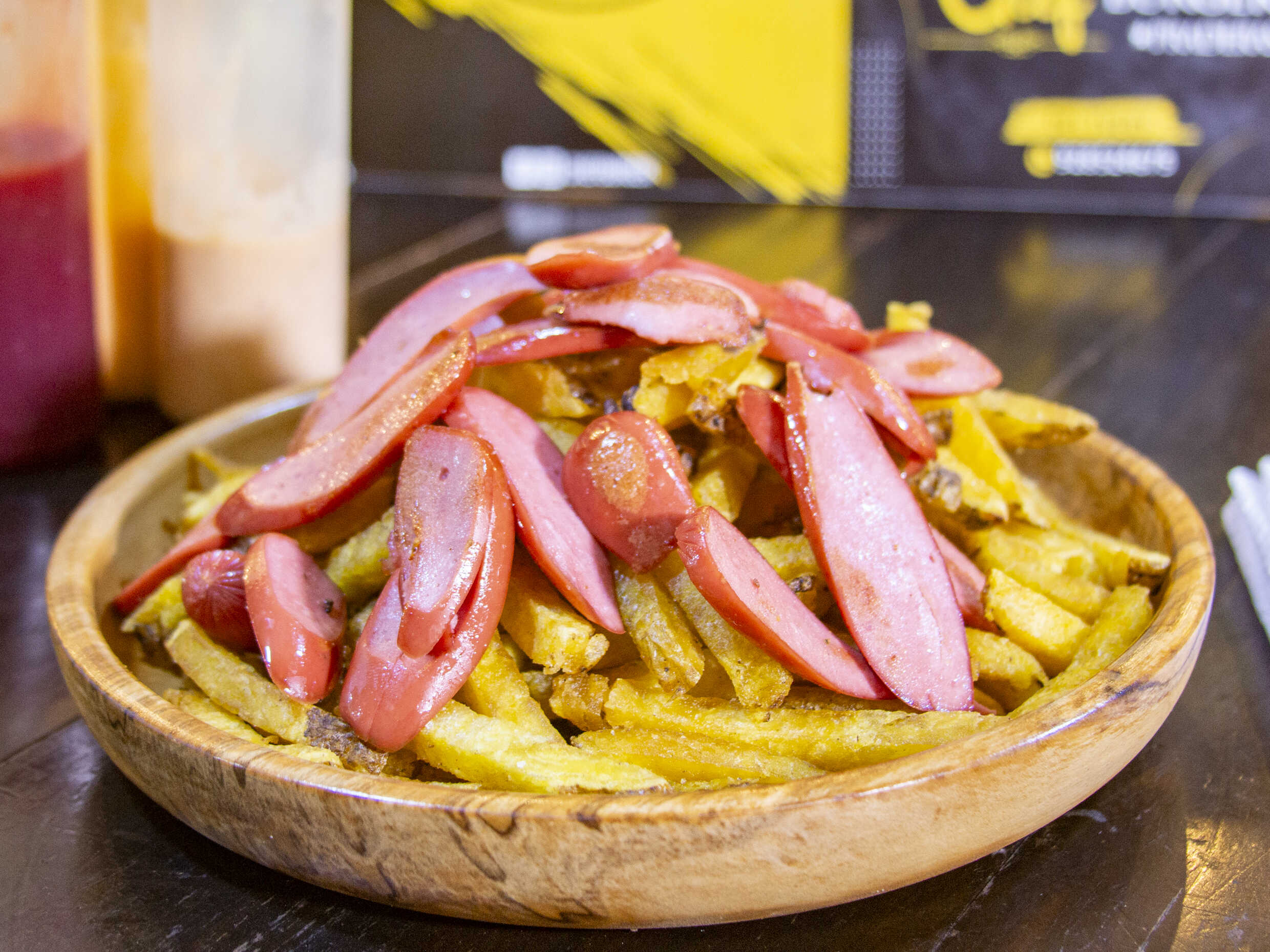 Salchipapa con papas fritas y cremas.