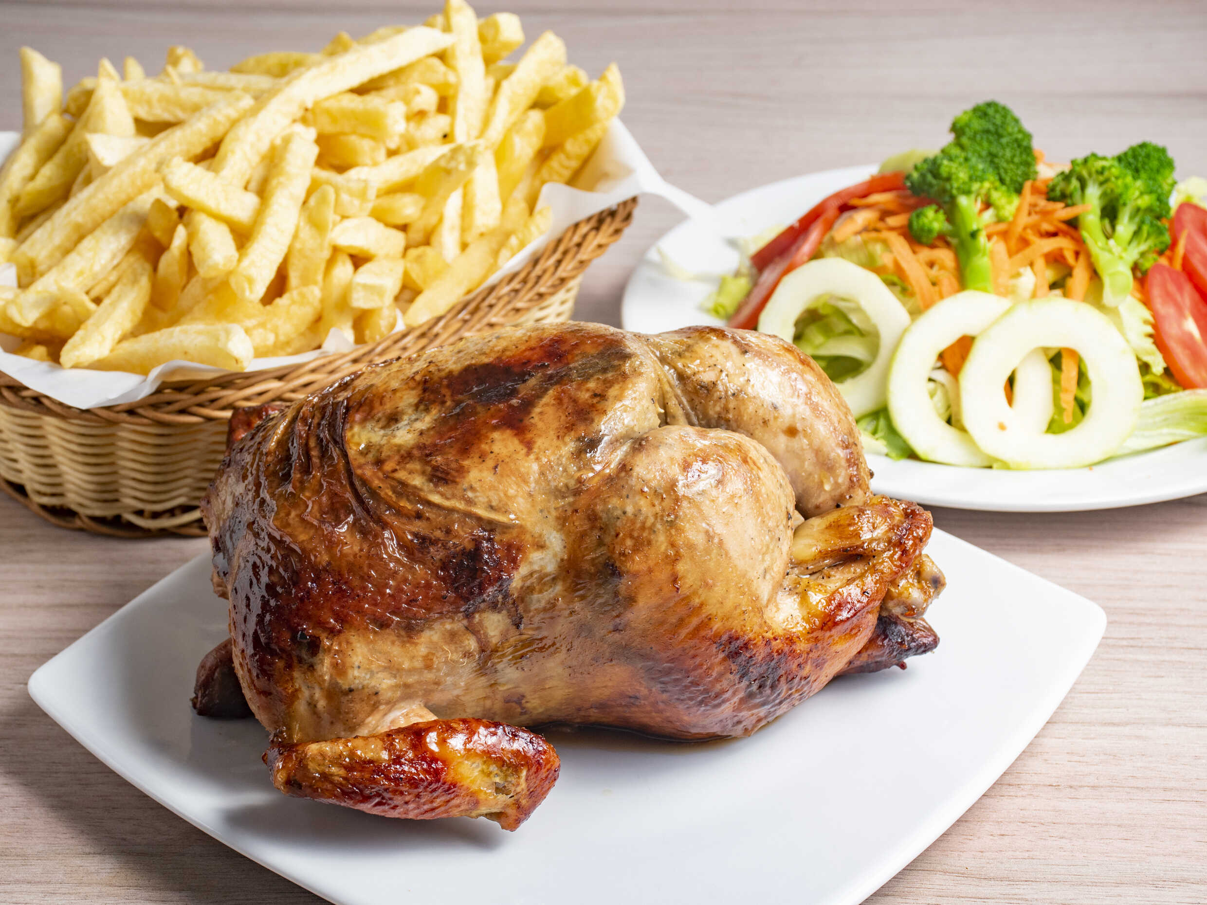 1/4 de Pollo a la Brasa( asado ) con 1 porción de papas a la francesa fritas( 250 gramos aprox ) , 4 cremas ( mayonesa, ketchup ají, vinagreta) sin ensalada