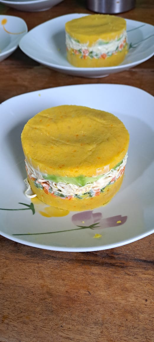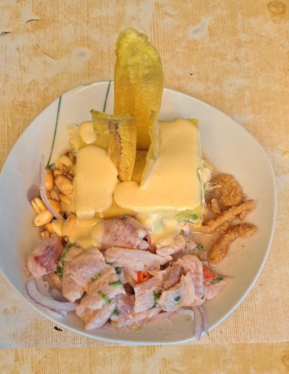 1 Causa rellena de pollo, ceviche, chicharrón de pota,cancha, mayonesa, huancaína y crema de rocoto.