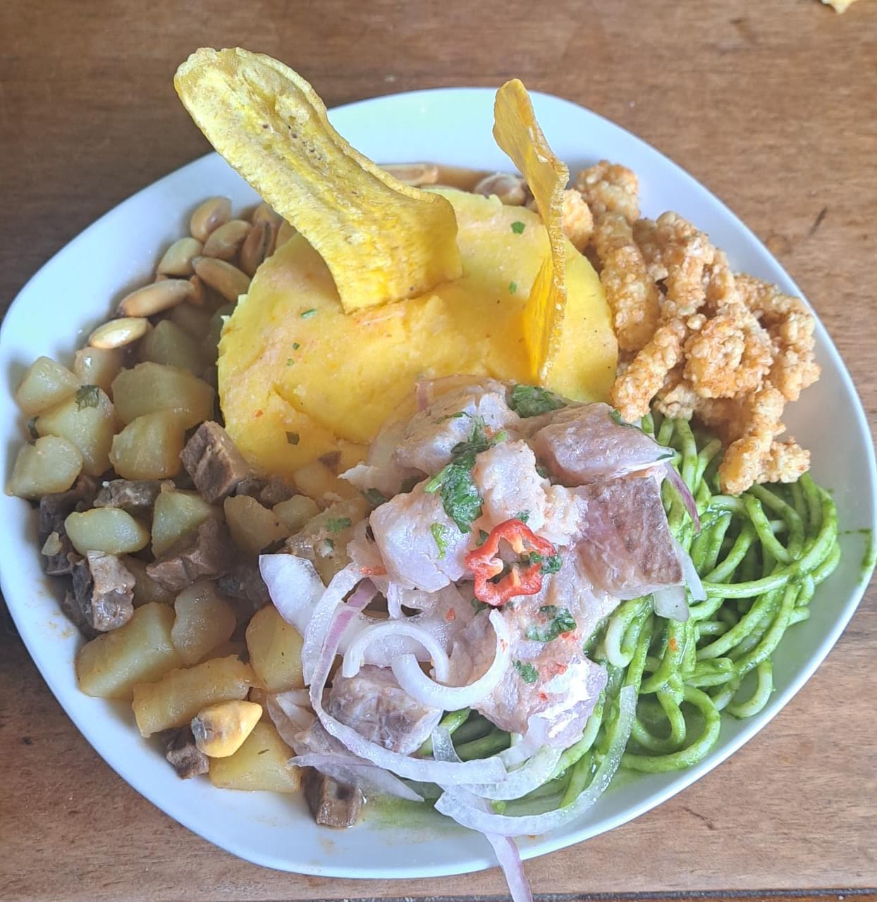 Tallarín Verde*1 + Chanfainita*1 + Papa a la Huancaína*1 + Ceviche de Pescado*1 + Chicharrón de Pota*1 + Canchita Serrana*1