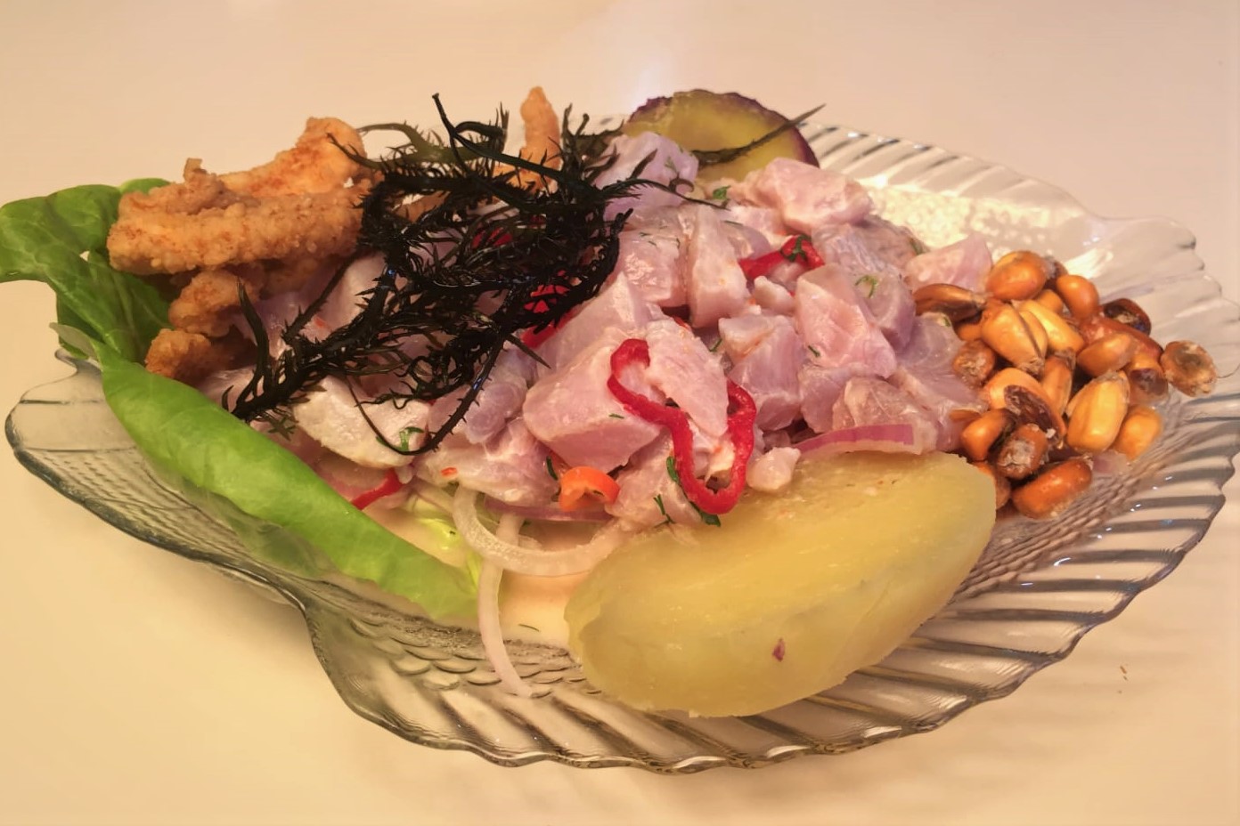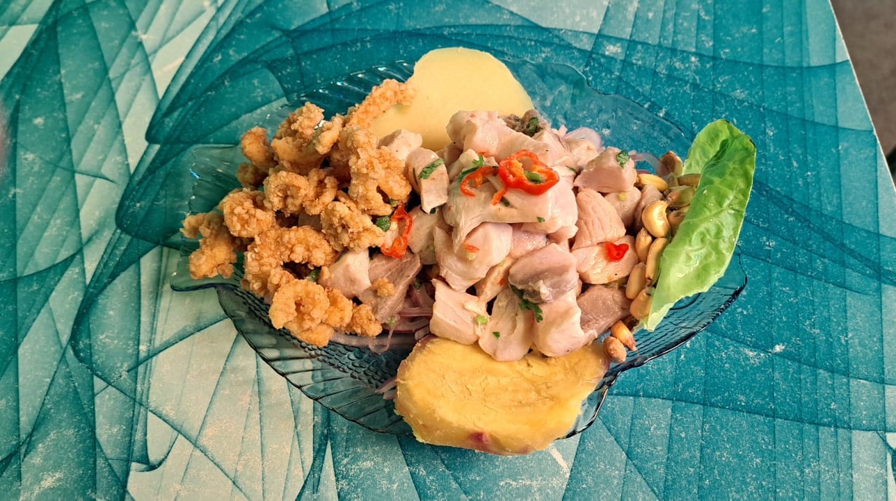 Ceviche, camote, cancha papa y chicharrón de pota