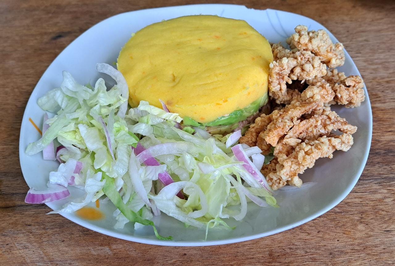 1 Causa rellena de pollo, chicharrón de pota, ensalada de lechuga, mayonesa, huancaína y crema de rocoto.