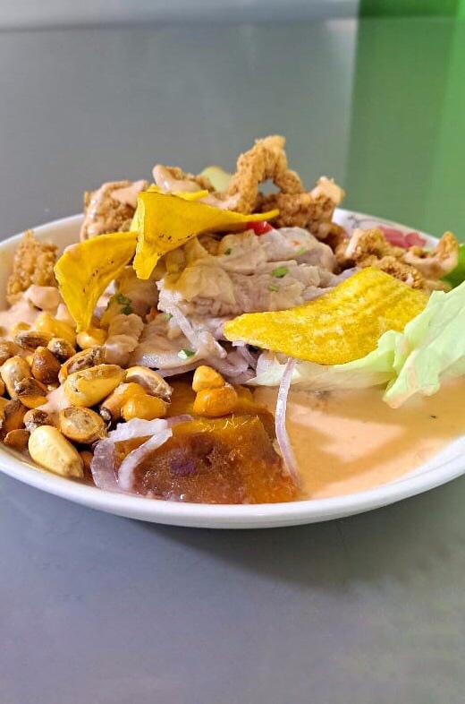 Tradicional, acompañado con chicharrón de pota, chifle y canchita.
