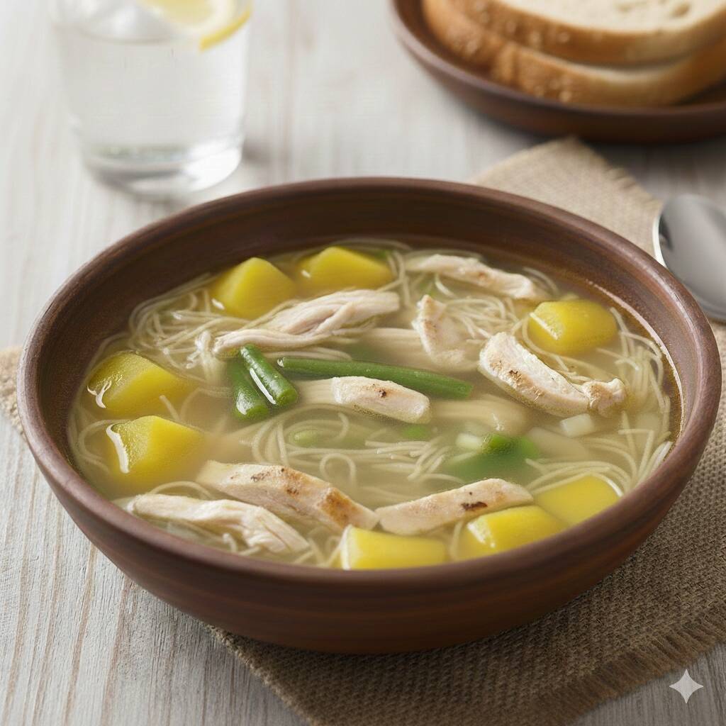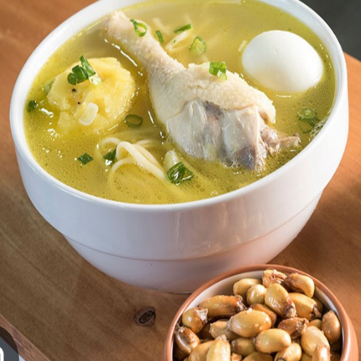Tradicional caldo concentrado de gallina con fideos y huevo.