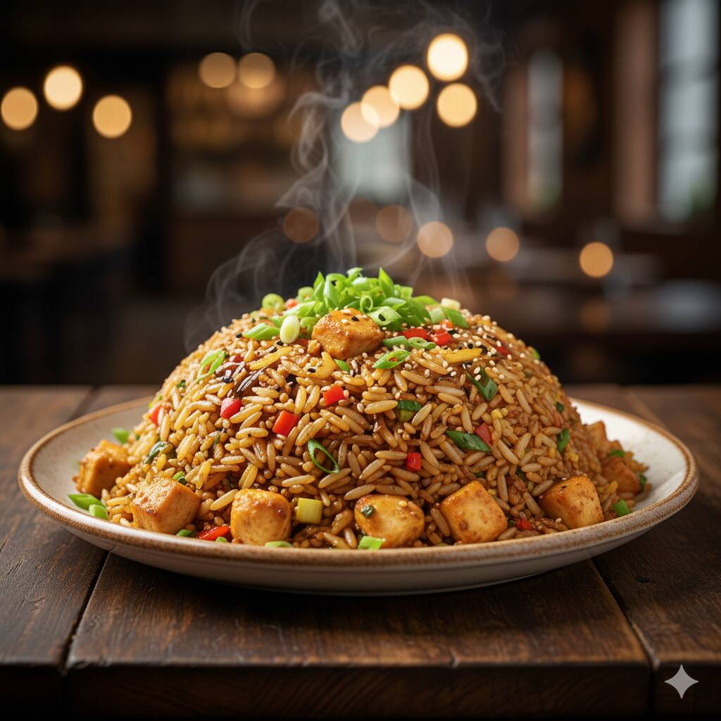 Arroz frito al estilo oriental con trozos de pollo y cebollita china.