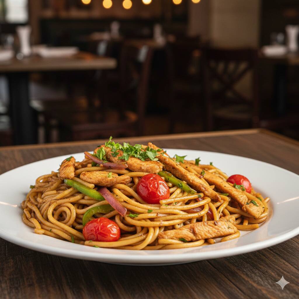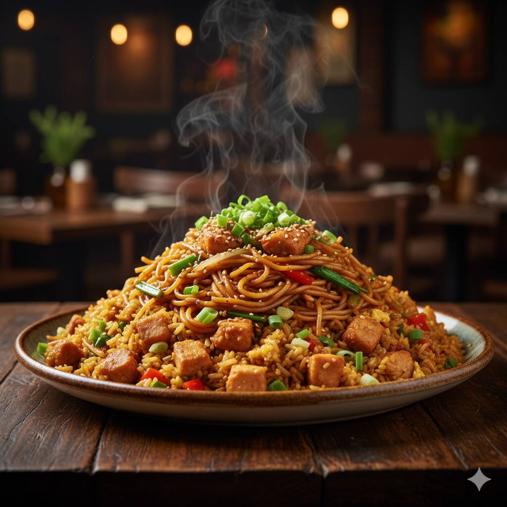 Combinación de arroz chaufa y tallarín saltado con pollo.