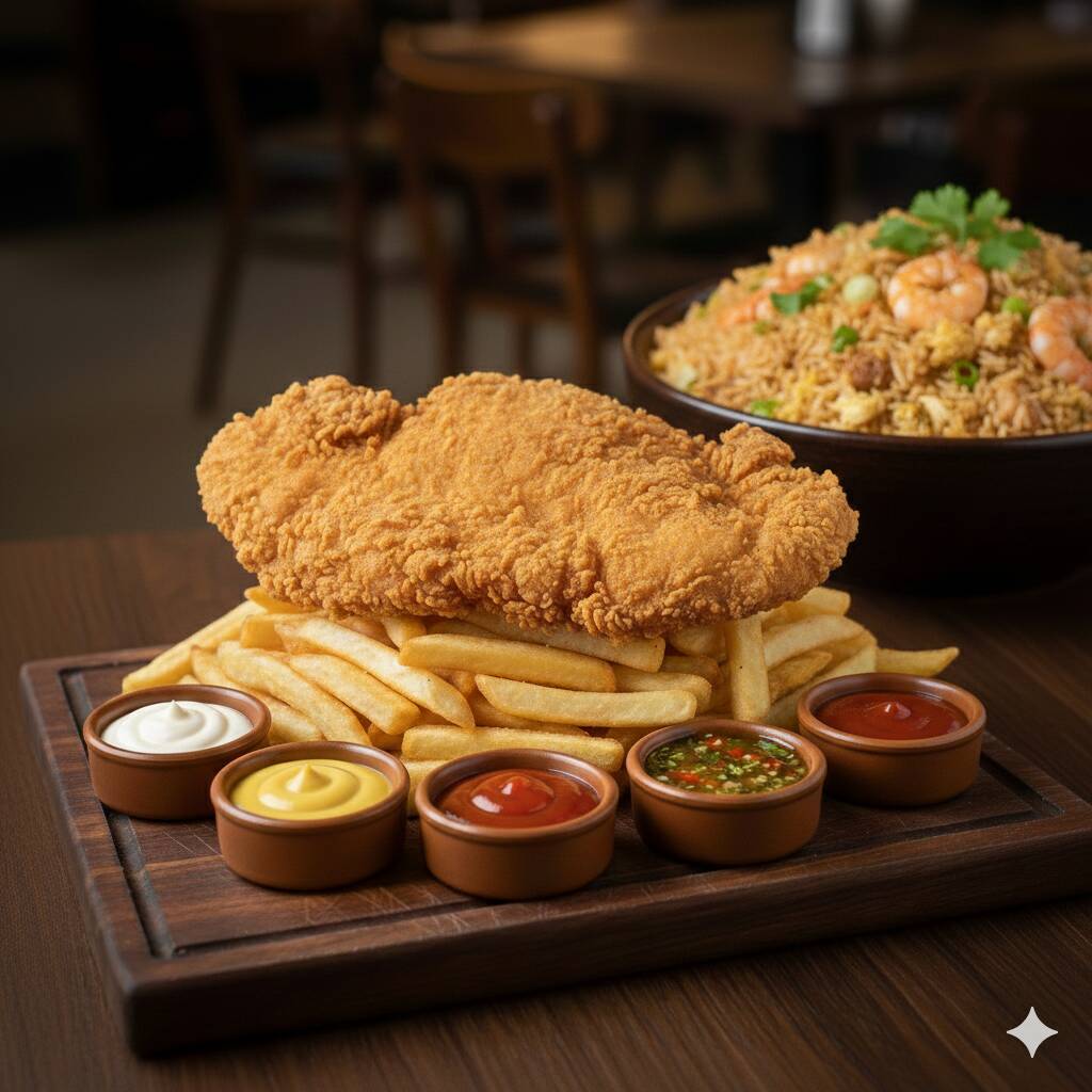 Combinación contundente de arroz chaufa con pollo broster y papas.