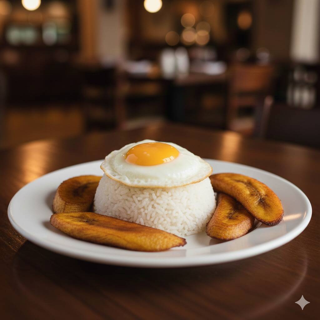 Plato clásico de arroz con huevo y plátano frito.