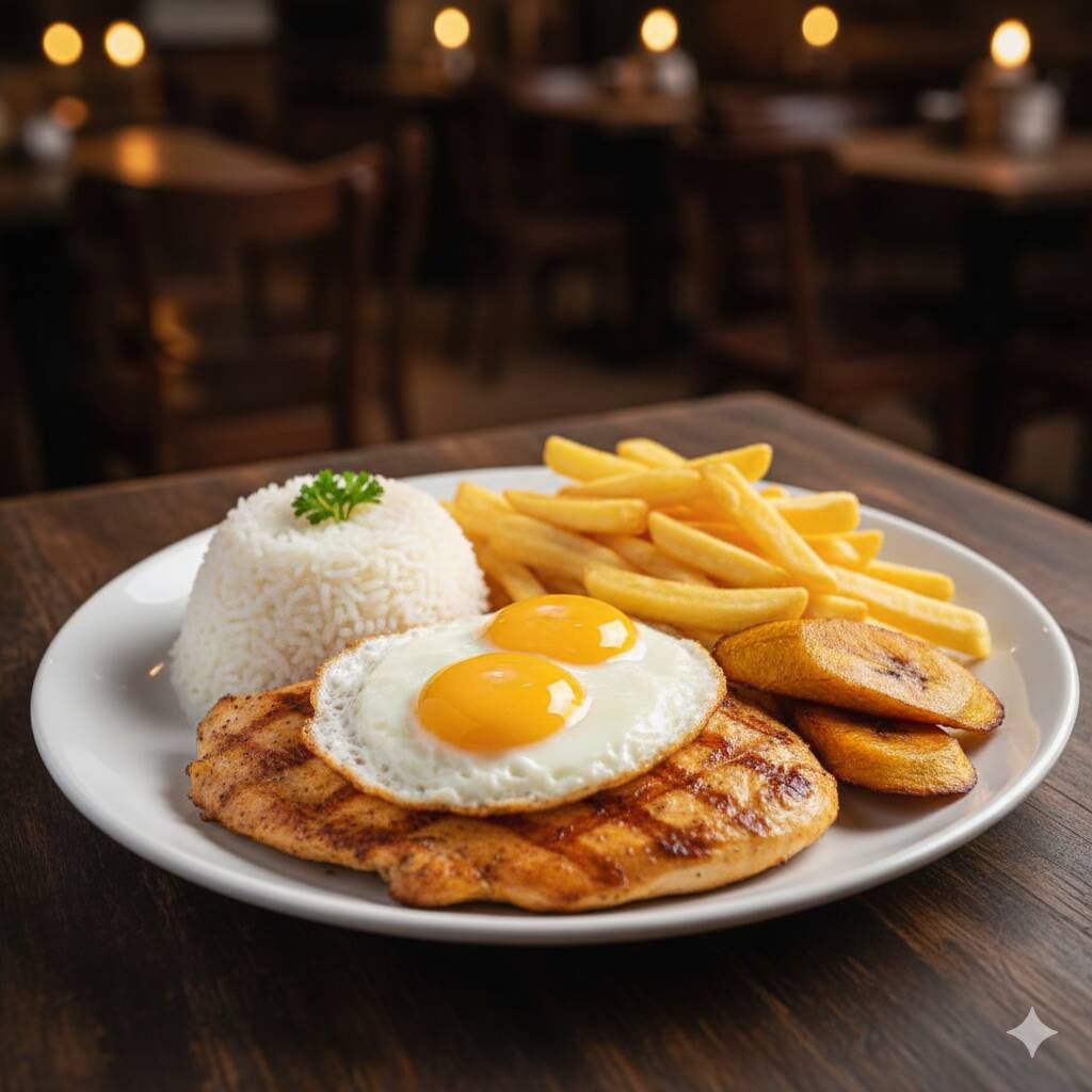 Pechuga de pollo a la plancha con arroz, papas, huevo y plátano.