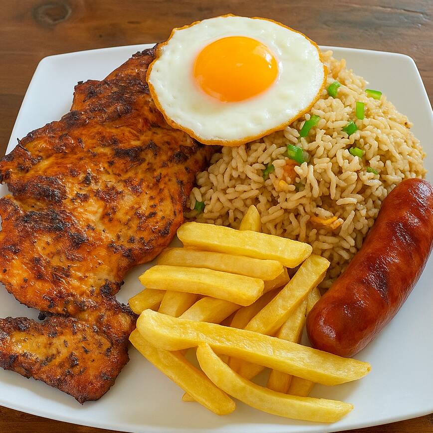 Filete de pechua a la parrila + arroz chaufa + papas fritas + huevo + chorizo y cremas