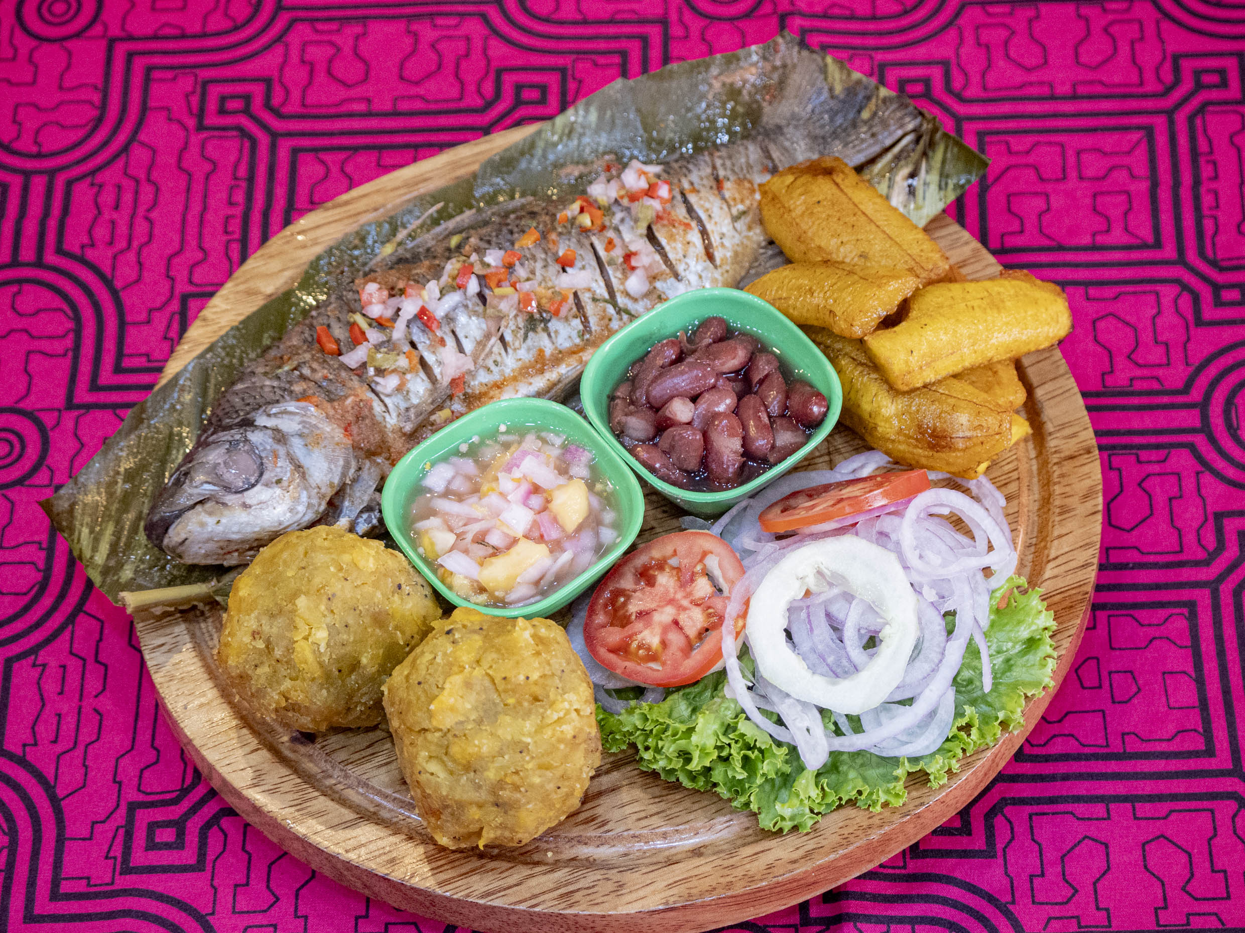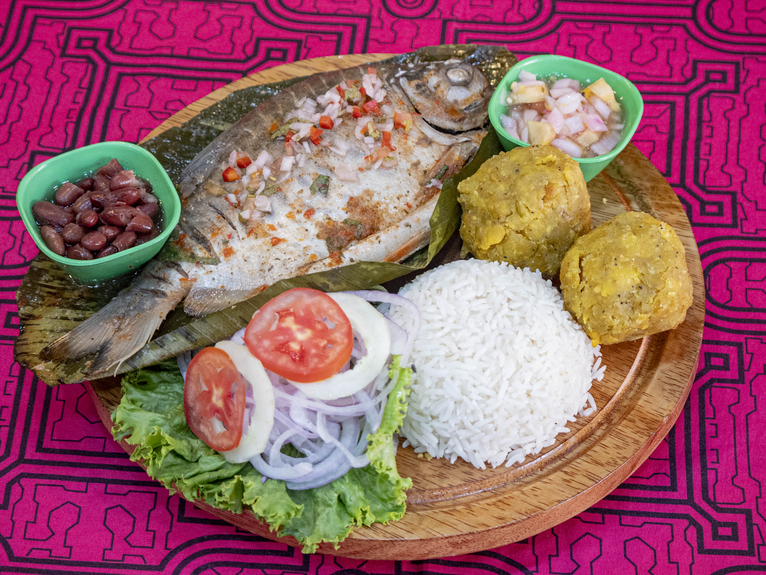 Pescado regional de la selva, acompañado con plátanos verdes y ají de cocona.