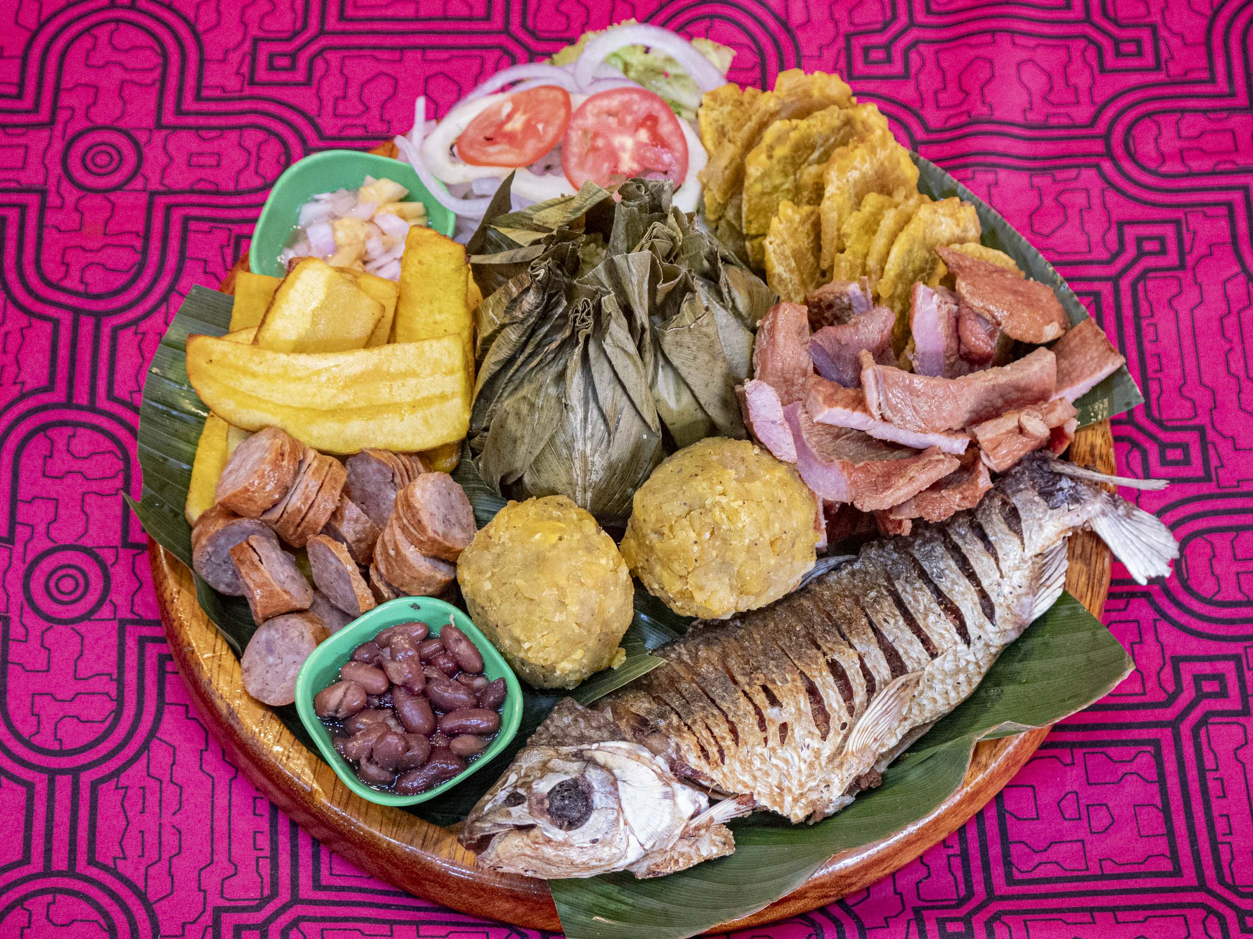 2 bolas de tacachos, cecina, platanos fritos, aji de cocona y ensalada criolla