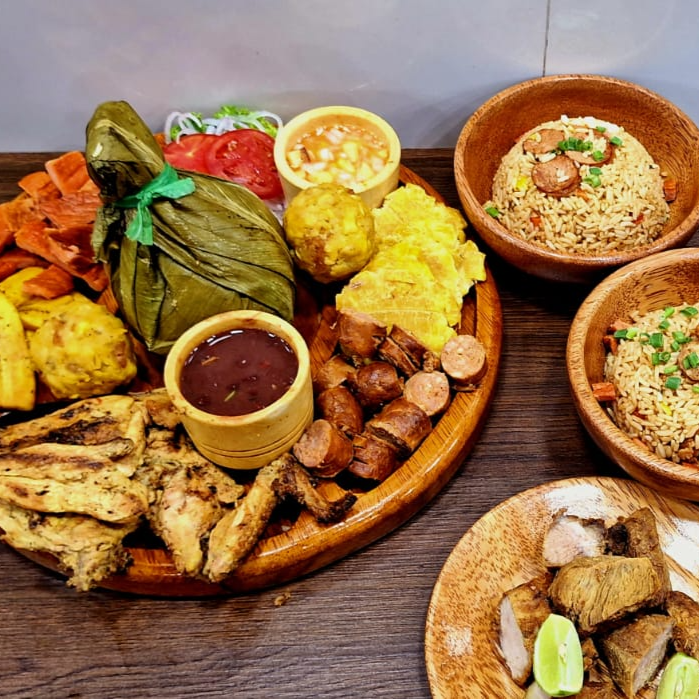 Chaufa mixto, tacacho, cecina, chicharrón de cerdo, patacones, plátano frito, chorizo, ensalada y ají de cocona.