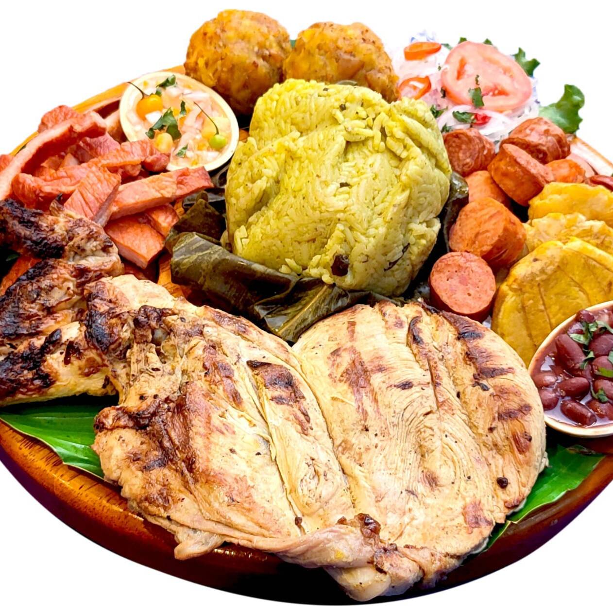 1/4 De pollo canga, juanecito, tacacho, cecina, chorizo, plátanos fritos, patacones, ensalada, frijolitos y ají cocona.