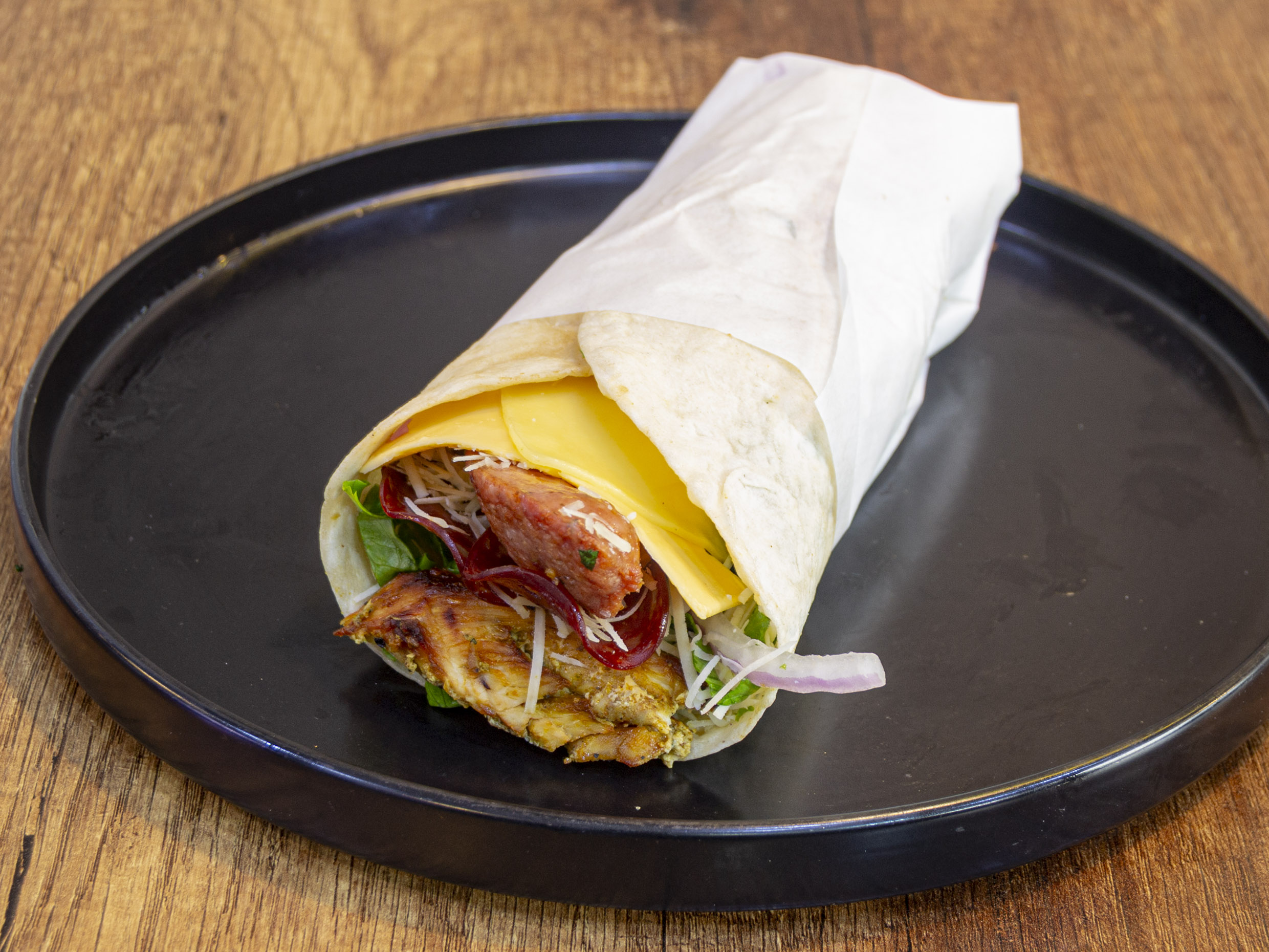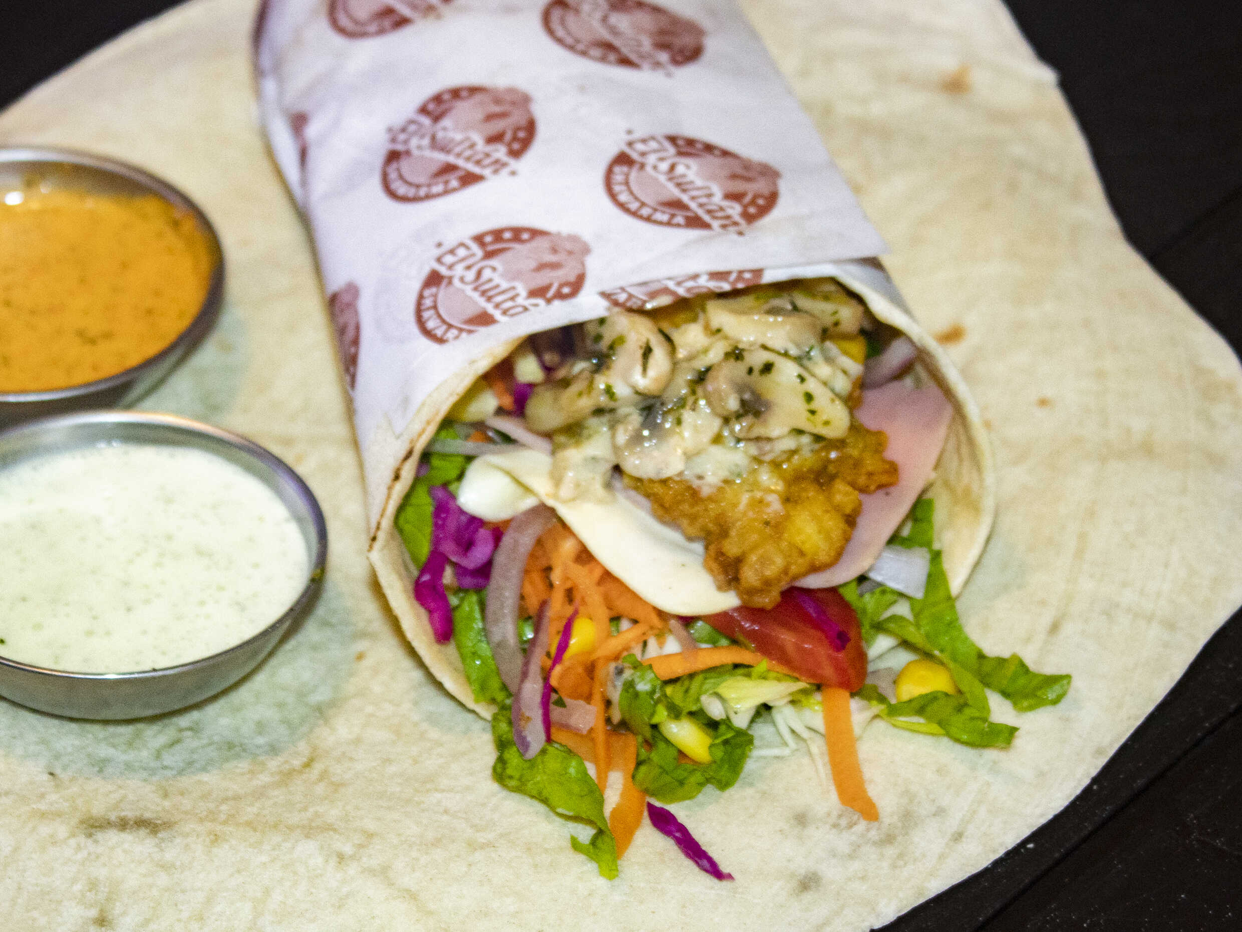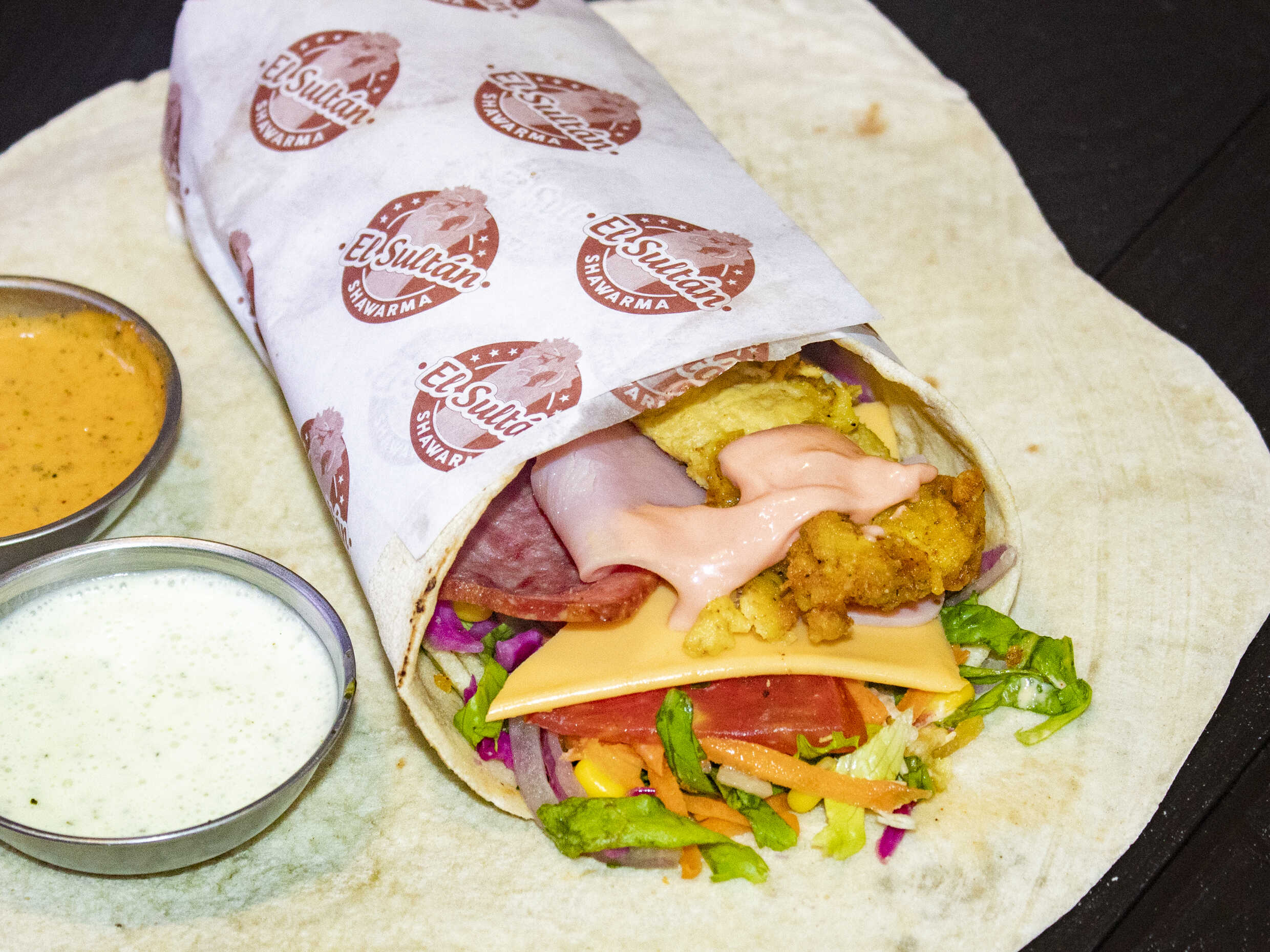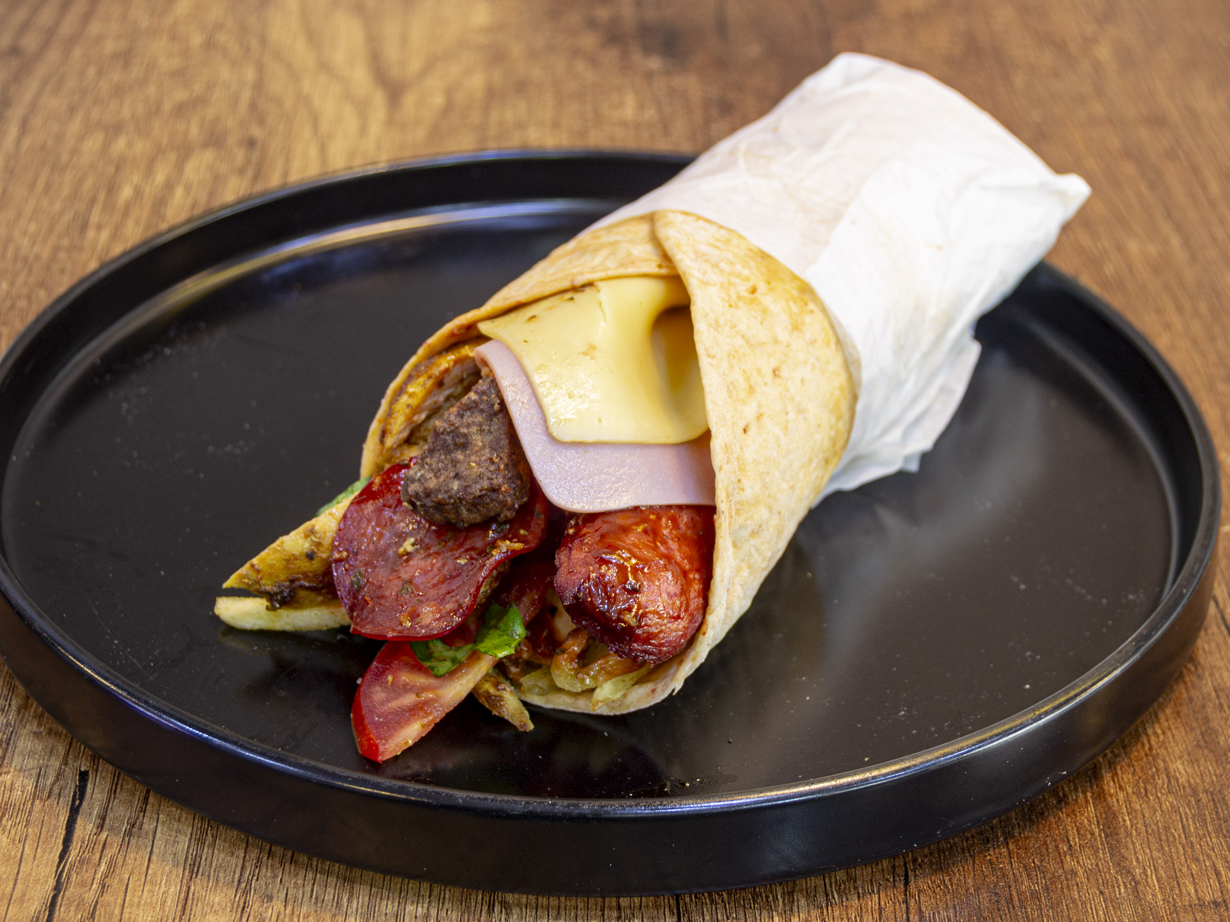 Pollo, kebab burguer, falafel, salsa de pimentón caramelizado, queso, papas al hilo y complementos