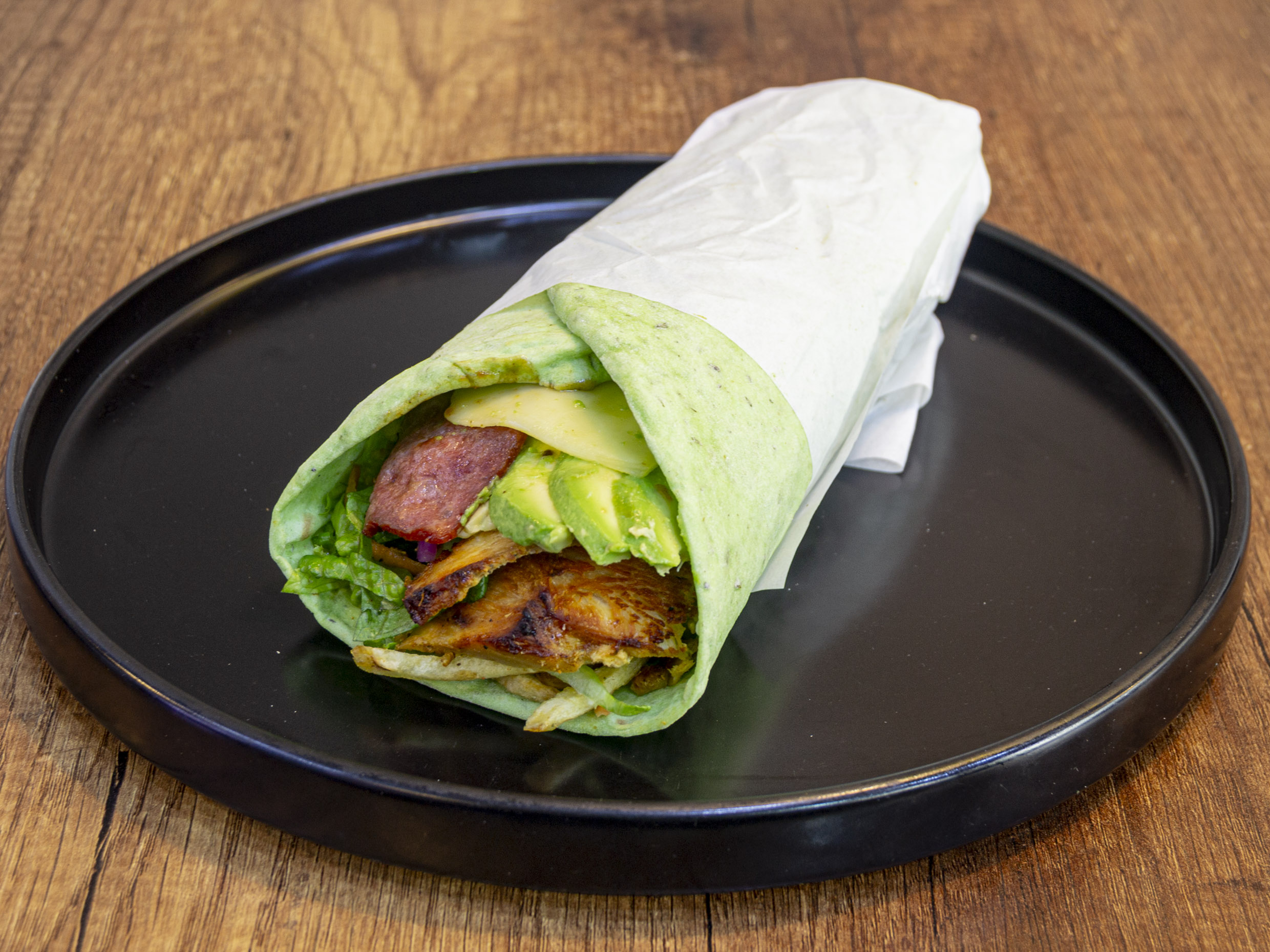Pollo, tocino crujiente, tajadas de palta, salsa vinagreta, salsa bbq, queso, papas al hilo y complementos