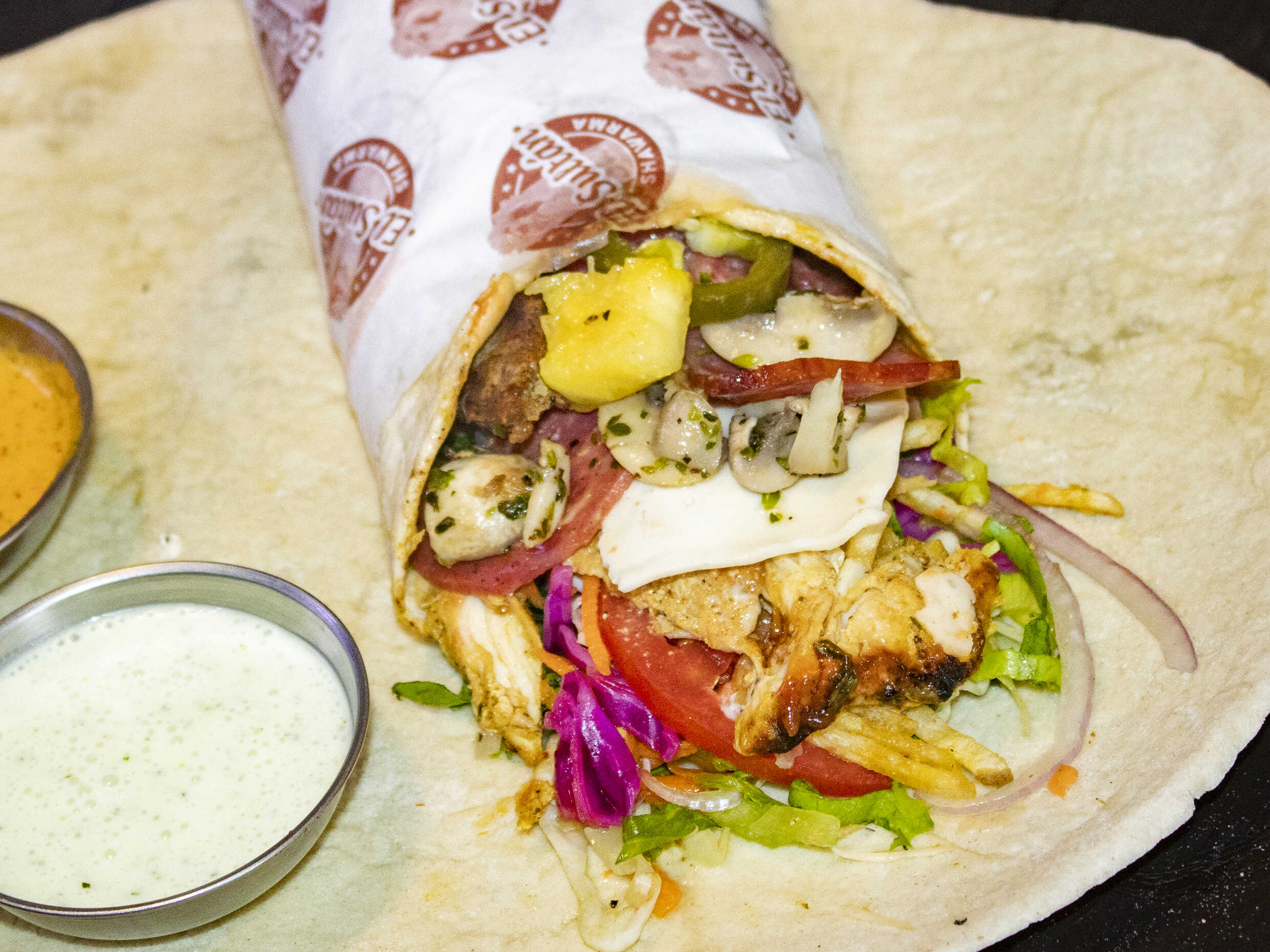 Pollo, kebab burger, salsa de tomate con oliva, langostinos salteados, papas fritas, queso y complementos