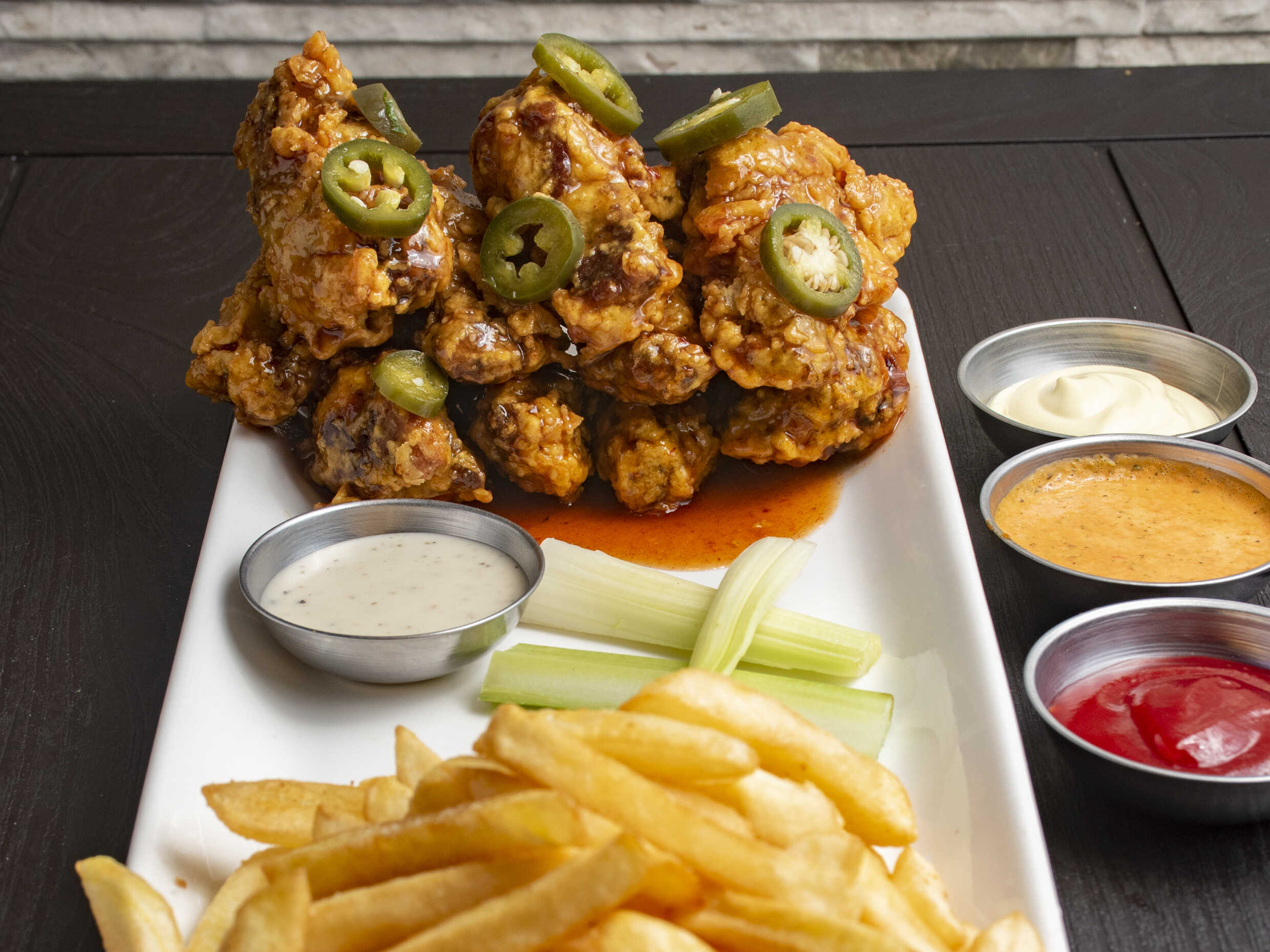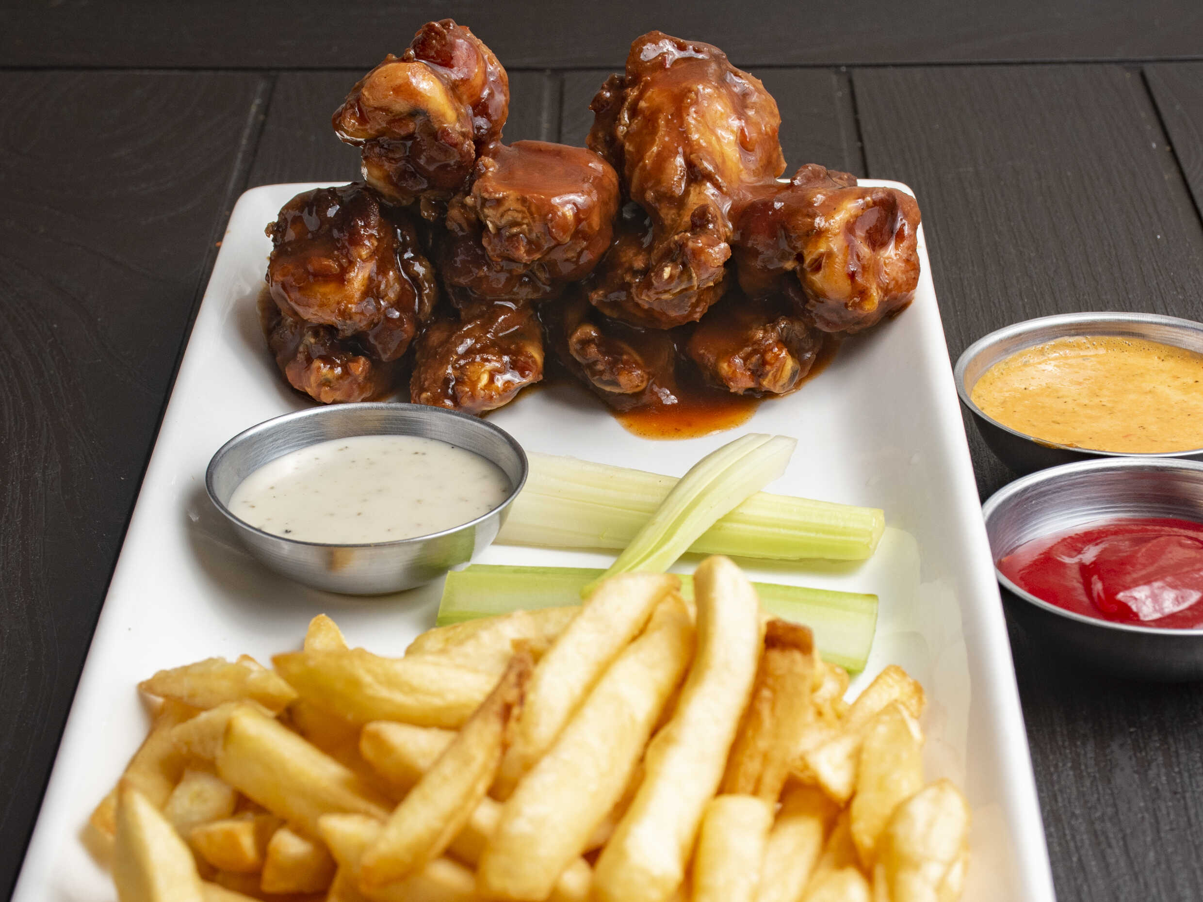 Alitas de pollo bañadas en salsa Honey Siracha (incluyen papas fritas, apios y salsa de queso azul)