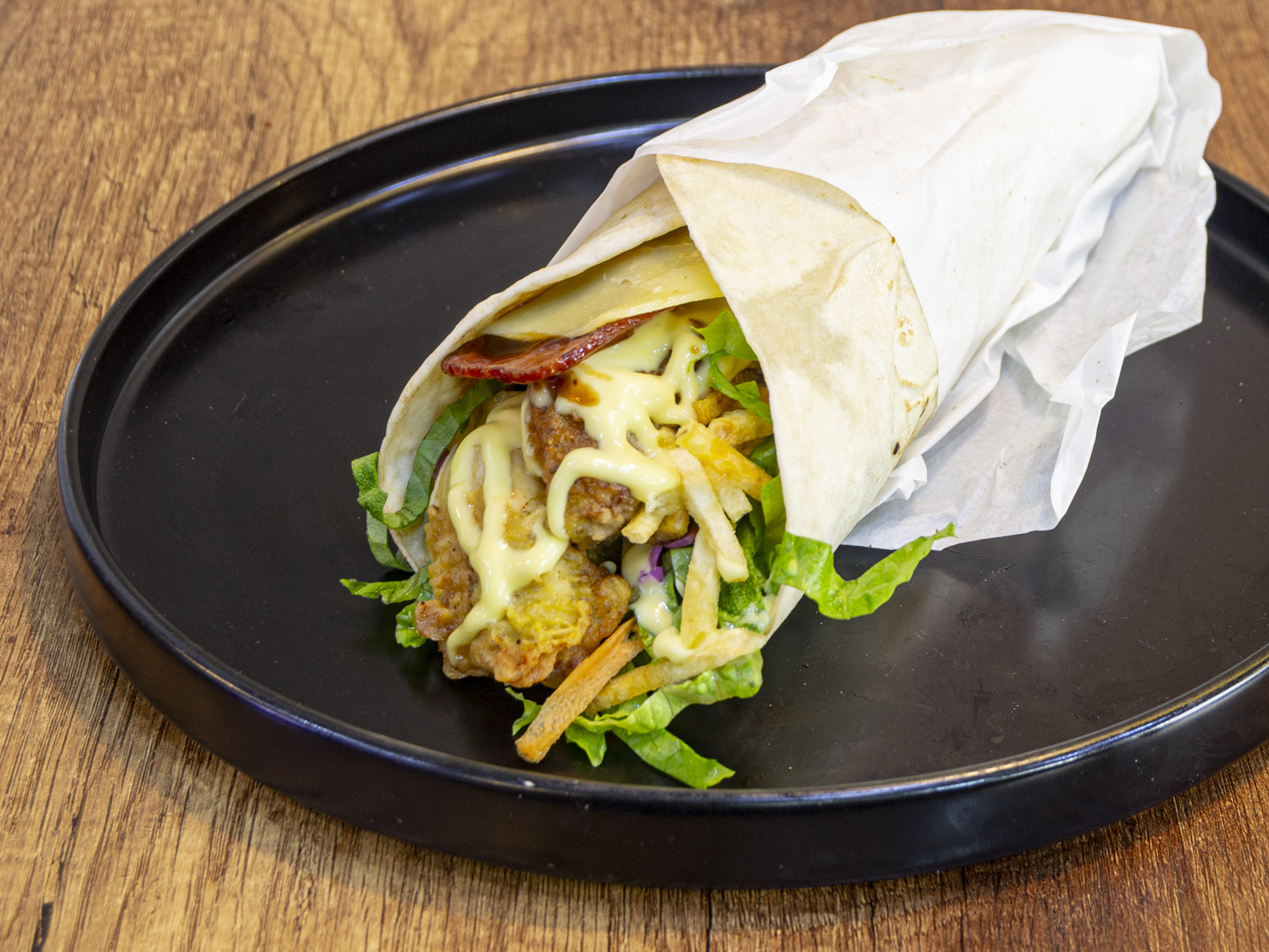 Pollo, kebab burger, tocino crujiente, salsa bbq, queso, papas al hilo y complementos