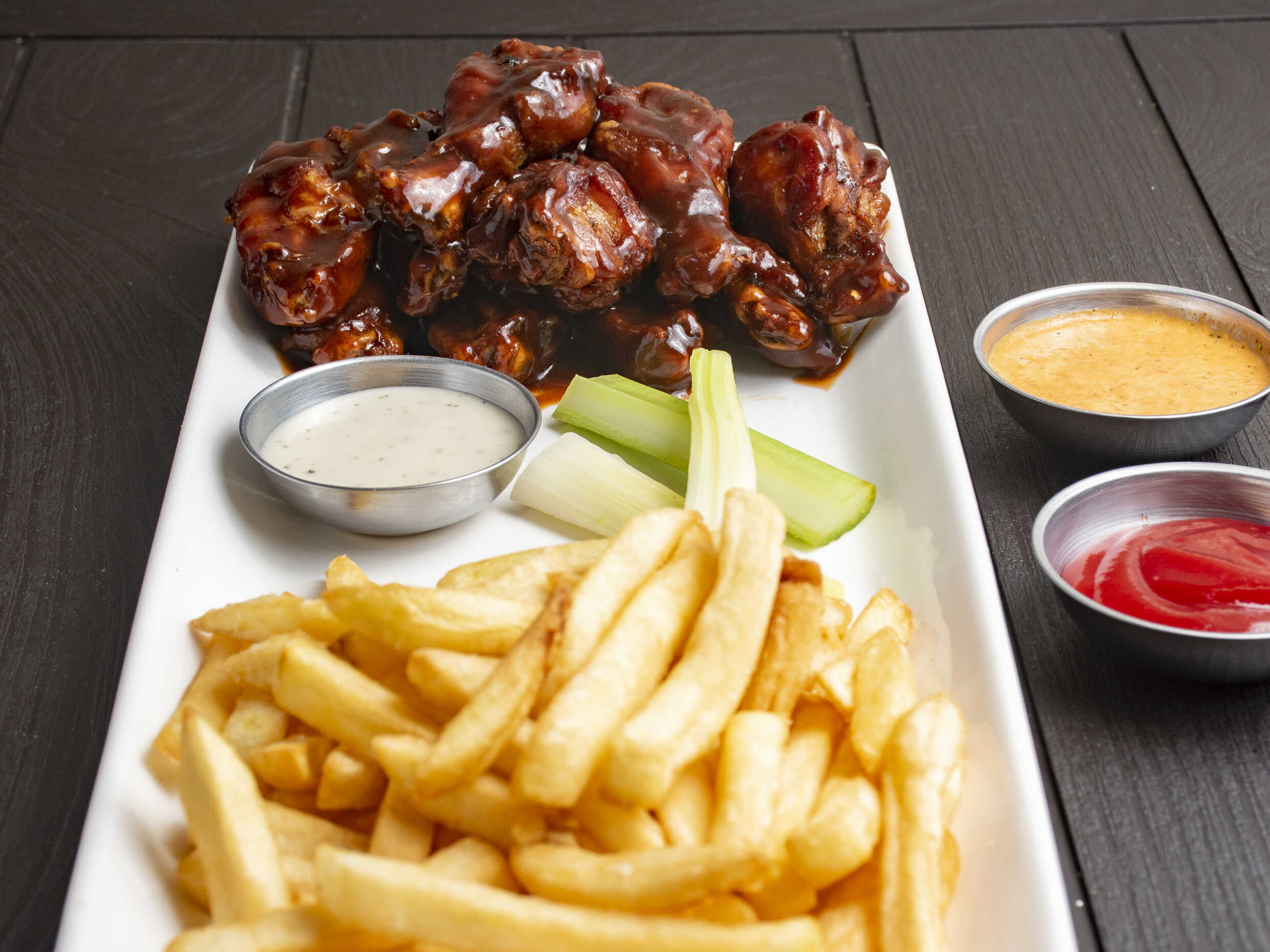 Alitas de pollo bañadas en salsa bbq (Incluyen papas fritas, apio, y salsa de queso azul)