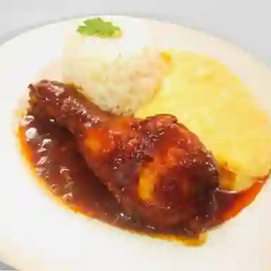 Pollo al horno con puré y arroz, opción a agregar entrada y gaseosa.
