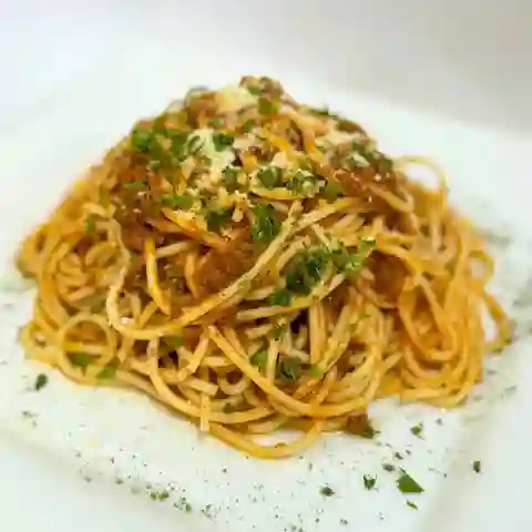 Tallarín a la boloñesa, opción a agregar entrada y gaseosa.
