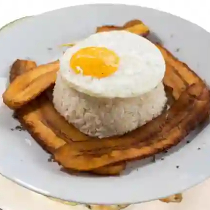 Arroz con huevo y plátano frito, opción a agregar entrada y gaseosa.