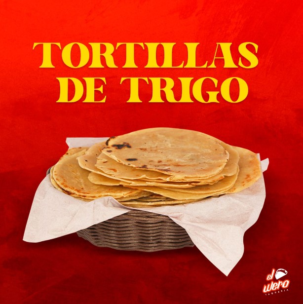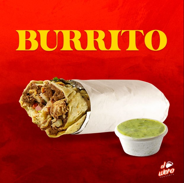 Tortilla de harina de 20 cm, pollo en adobo y carne molida, crema de palta, cebolla con tomate, salsa picante, salsa roja, crema de frijoles y queso derretido.