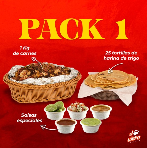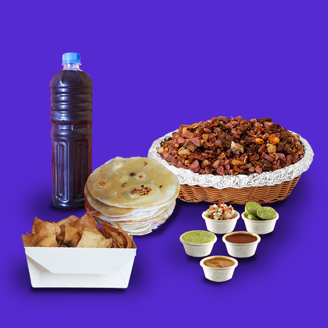 500 Gramos de carne, pollo y chancho con salchicha más 15 tortillas, crema de palta, cebolla con tomate, salsa picante, salsa roja y limón. Cantidad para 15 unidades de tacos.