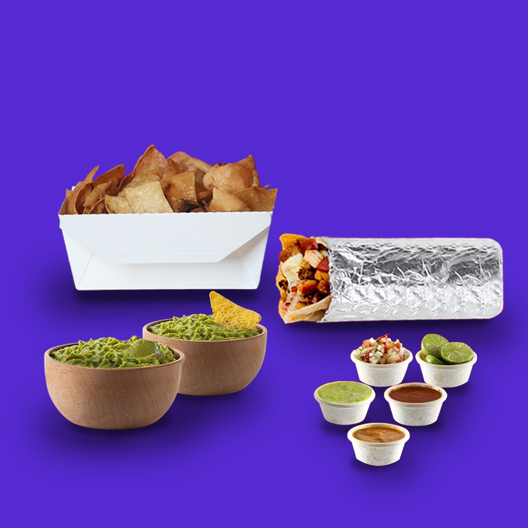 1 miniquesiburrito + salsas + media porcion de nachos + 2 guacamoles personal