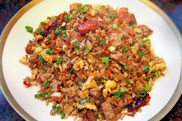 Chancho, arroz, sillao y cebolla china.