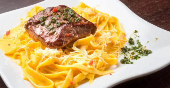 Tallarin a la Huancaína con Churrasco