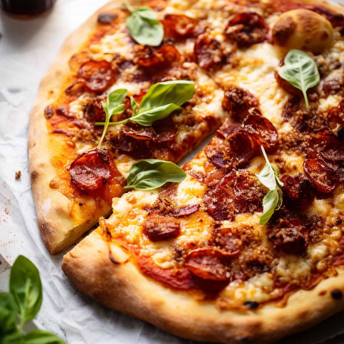 Masa artesanal cubierta con salsa roja especial, mozarella, jamon, durazno, piña y tocino
