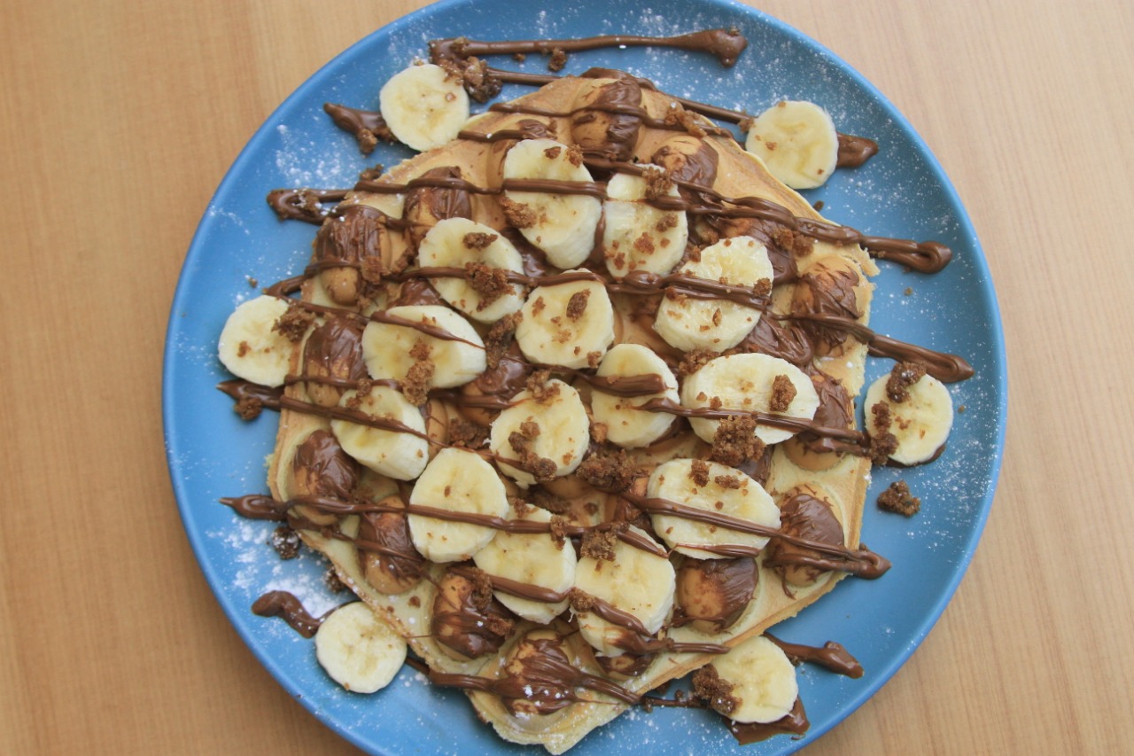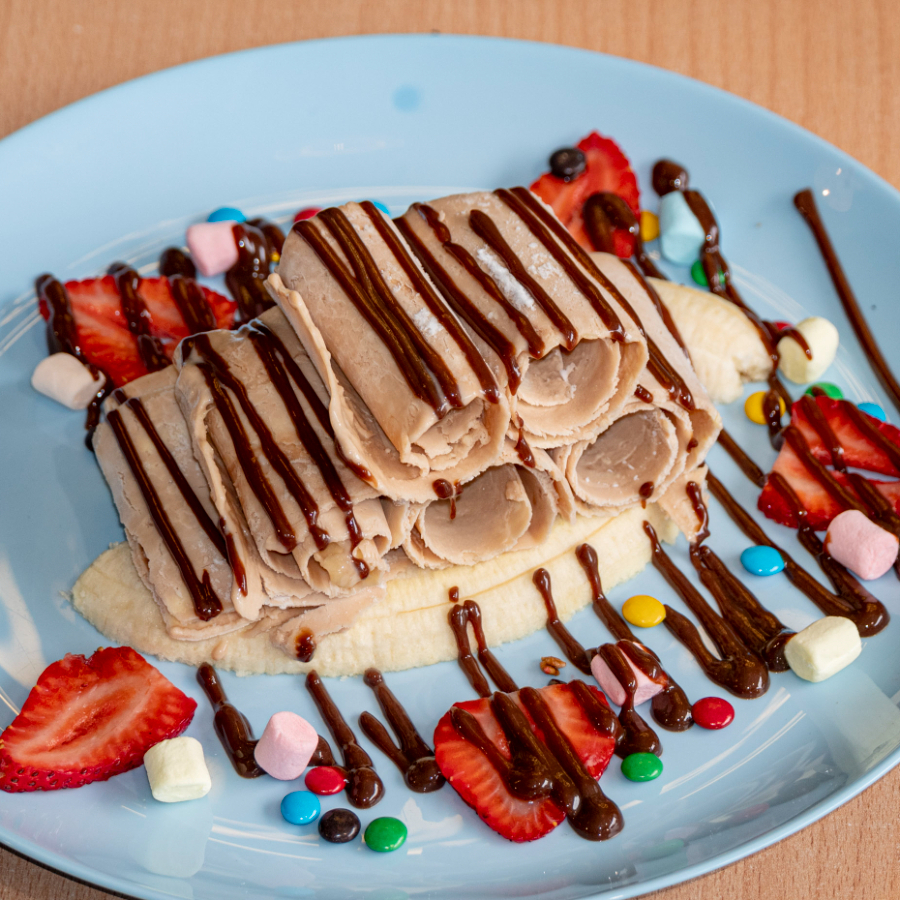 3 Sabores, 3 topping, 1 jalea y plátano.