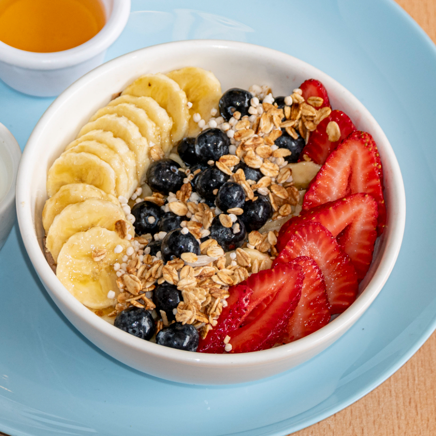 Plátano, fresa, mango, papaya, arándanos, yogurt de vainilla, miel, algarrobina y quinua pop.