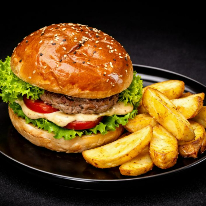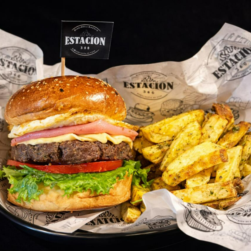 140 g De carne, huevo, queso, jamón, lechuga orgánica, tomate y porción de papas nativas.