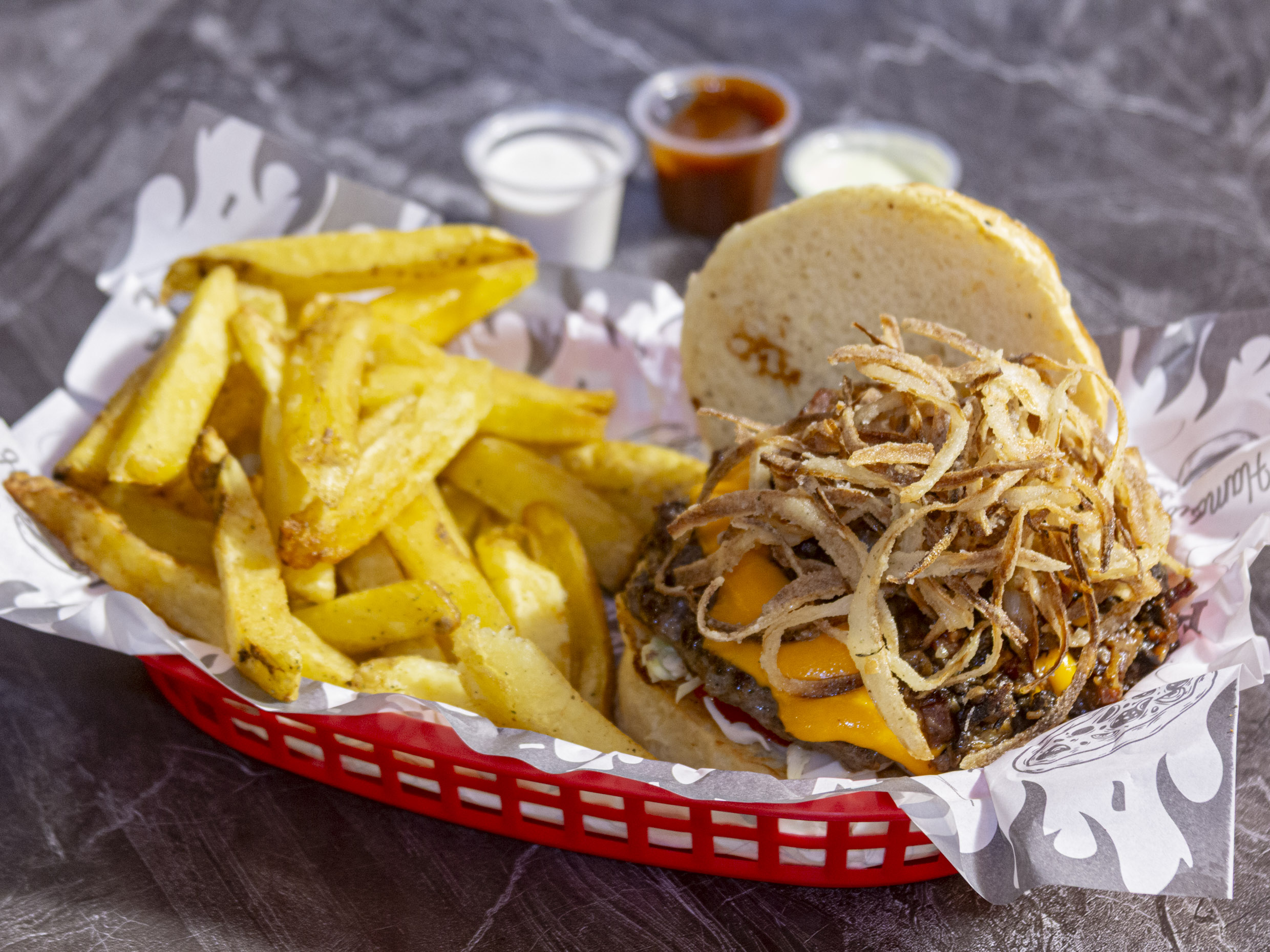 Hamburguesa doble, queso doble, huevo, tocino, pickles y papas fritas.