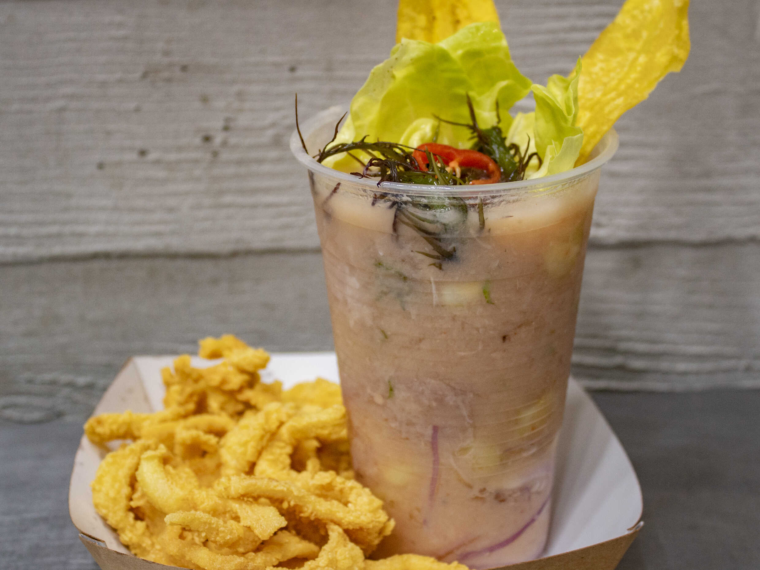 Chicharrón de pota, cebiche de pescado y causa de atún.