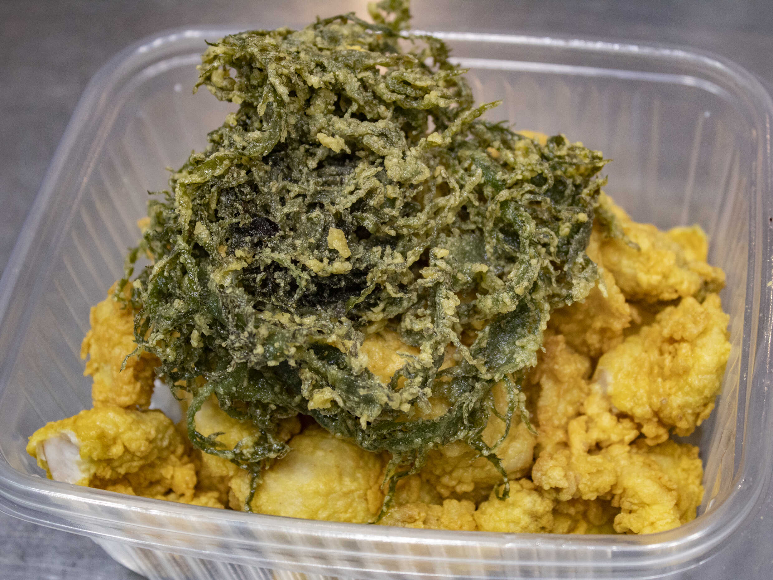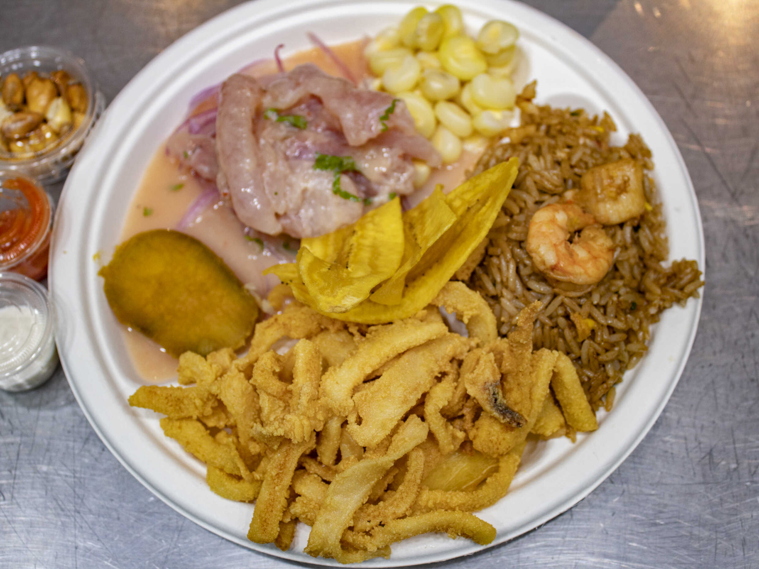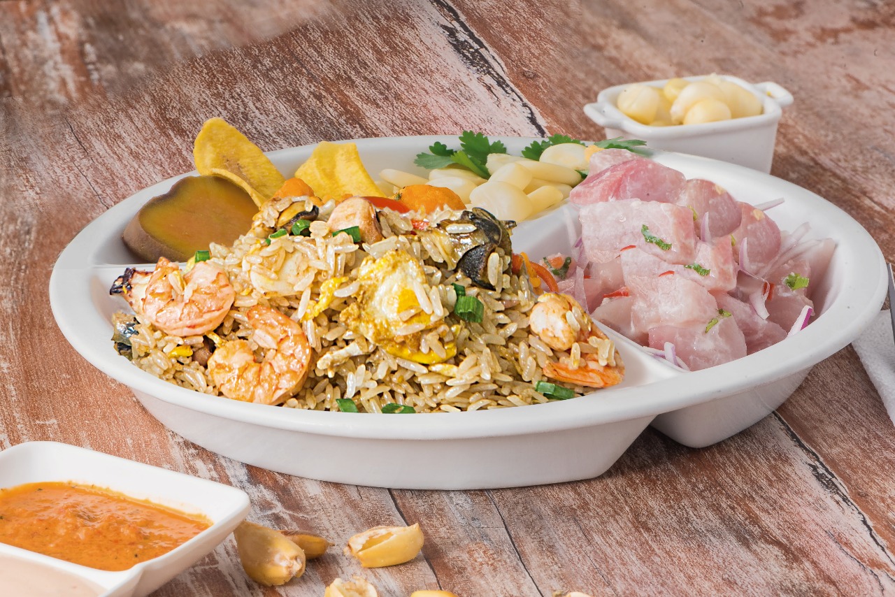 Ceviche, chicharrón de pota y chaufa de mariscos.